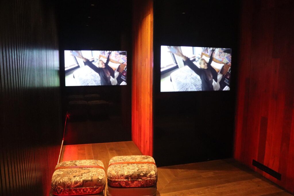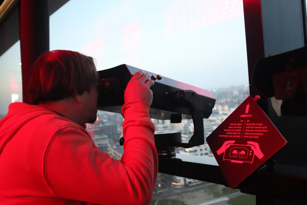 When getting to the bottom of the A’Dam Lookout, you enter through the side of a gift shop and head to an elevator up some stairs. This elevator is running after few minutes (after you get an entry ticket). Inside the elevator, which goes quite quickly, there is a sort of light show on your way up, as the elevator itself is clear and there are fun lights on the outside. Then, you end up at the first floor. This floor contains a large bar, a restaurant, a VR-experience that you can book tickets too, and a free cinema. We did not do the VR roller coaster experience, which had you sitting in a VR chair and everything, due to having a VR at home and not finding it that interesting. We did check out the bar and the view around the bar, which was fantastic! You are completely closed in glass, so this is a bit less scary than outside on the deck. There are also lockers here where you can place your items if you want too! The cinema view movie had comfortable seating, but was basically a small history on the building and an ad for the hotel at the base of the lookout.