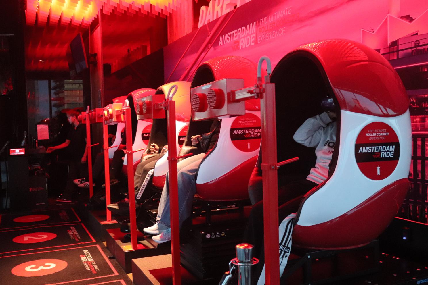 When getting to the bottom of the A’Dam Lookout, you enter through the side of a gift shop and head to an elevator up some stairs. This elevator is running after few minutes (after you get an entry ticket). Inside the elevator, which goes quite quickly, there is a sort of light show on your way up, as the elevator itself is clear and there are fun lights on the outside. Then, you end up at the first floor. This floor contains a large bar, a restaurant, a VR-experience that you can book tickets too, and a free cinema. We did not do the VR roller coaster experience, which had you sitting in a VR chair and everything, due to having a VR at home and not finding it that interesting. We did check out the bar and the view around the bar, which was fantastic! You are completely closed in glass, so this is a bit less scary than outside on the deck. There are also lockers here where you can place your items if you want too! The cinema view movie had comfortable seating, but was basically a small history on the building and an ad for the hotel at the base of the lookout.