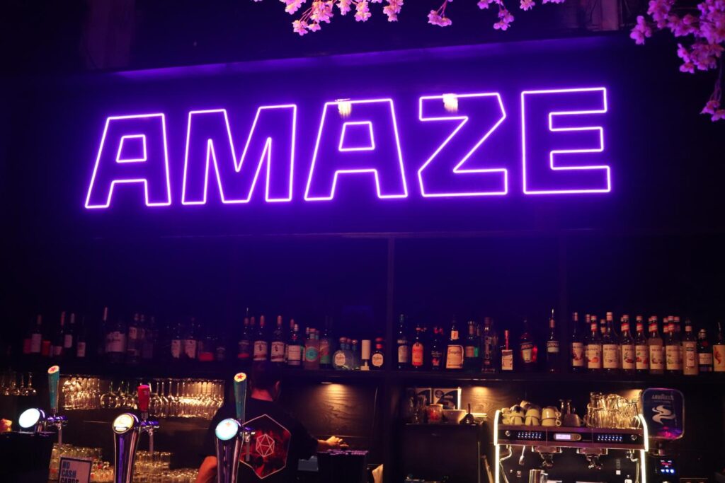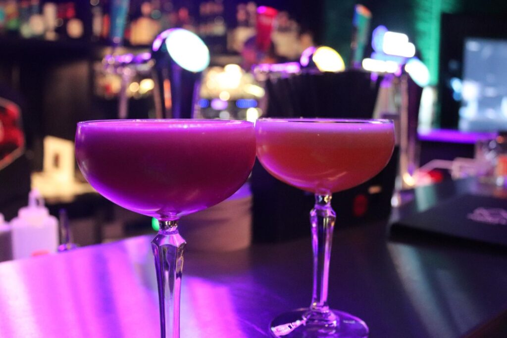 Another large interactive room in AMAZE, right before the end, allowed you to place records and listen to them from two different stations, swing on a swing that went through a bunch of digital spaces from the jungle to colorful worlds that don’t make sense. There was also a DJ mixing set here, as music seemed like a big theme. Then, everyone went into a hurricane room, where music played, lights flashed, and small bits of confetti rained everywhere. It was a really fun end to AMAZE, before walking us through the gift shop and back out to the bar. There, we got our cocktails – with Dann picking the orange signature one with hot sauce and mango, and me picking the fruity signature, that tasted like sorbet. It’s just a fun little experience that’s worth going to.