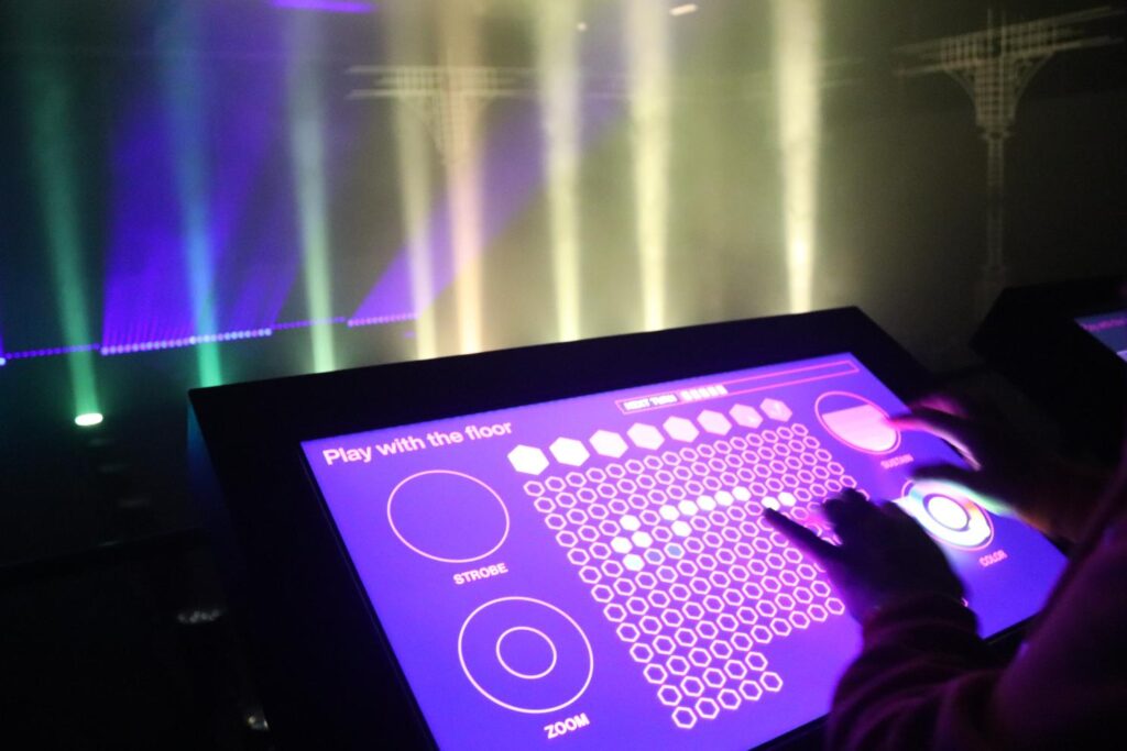 Some of the other rooms included a mirror maze, with a bunch of panels that showed AI versions of the pictures we took of ourselves, flashing in different outfits. Another room had tons of music and bean bag chairs, acting like a party after we pushed ourselves past dozens of mannequins (some of which had our AI faces on them) which also had a lot of AI. I do feel that the use of AI in this experience (and in general) isn’t great. There were a bunch of other rooms though to focus on! One was full of panels, which allowed us to control different aspects of a room. At first, Dann and I were on a panel that let us control the colors of the lights on the floor in front of us, along with all of the patterns when they lit up or if they strobe. It’s so fun! After a while, it then said to switch, so we went to the next panel which controlled the wall lights. Another controlled the music. It was just a lot of fun!