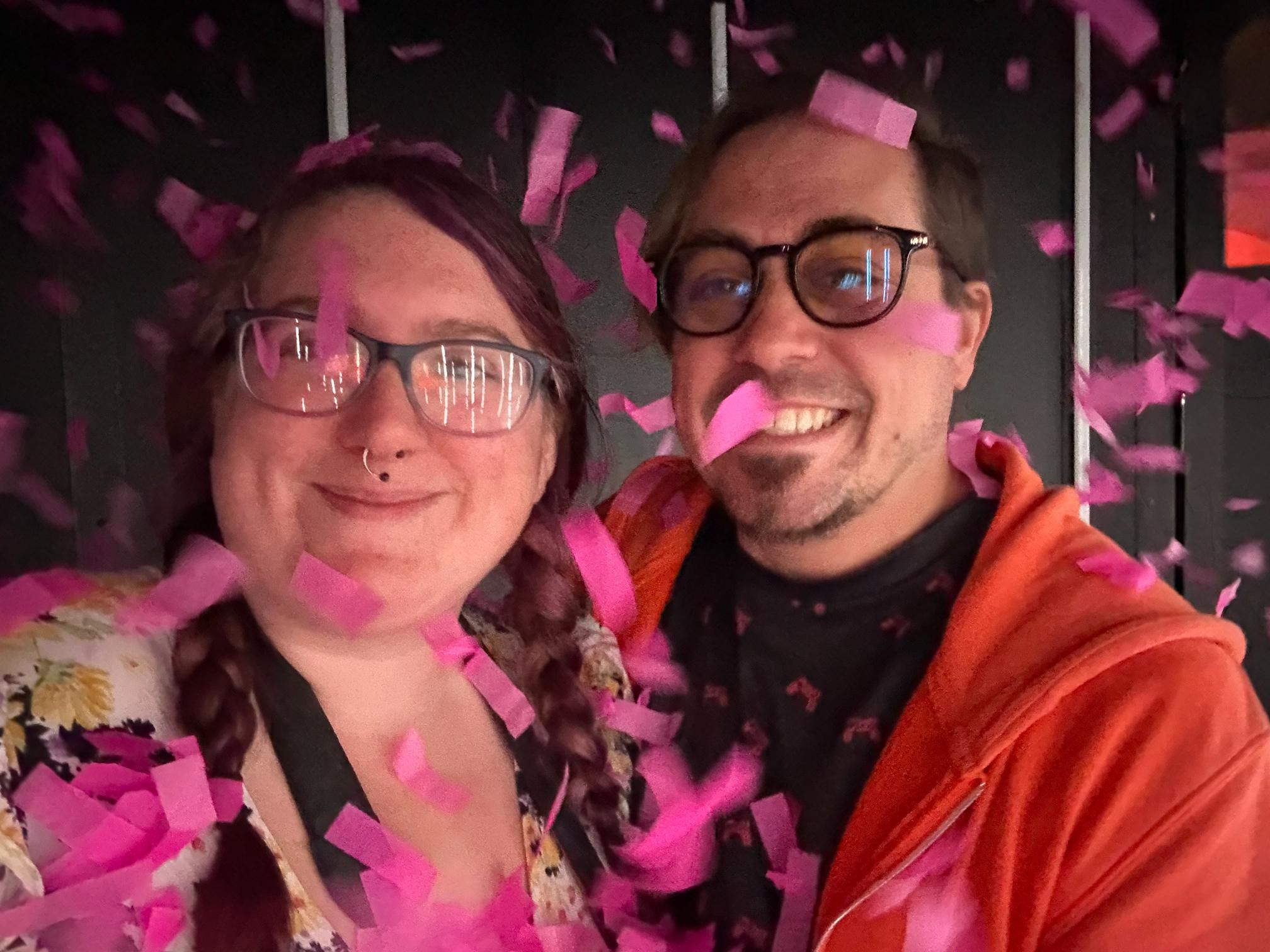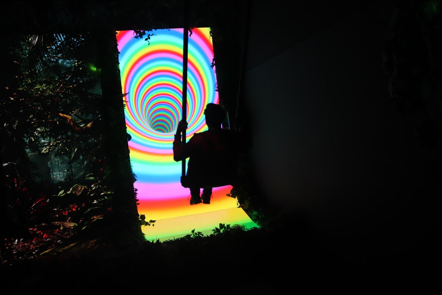 Another large interactive room in AMAZE, right before the end, allowed you to place records and listen to them from two different stations, swing on a swing that went through a bunch of digital spaces from the jungle to colorful worlds that don’t make sense. There was also a DJ mixing set here, as music seemed like a big theme. Then, everyone went into a hurricane room, where music played, lights flashed, and small bits of confetti rained everywhere. It was a really fun end to AMAZE, before walking us through the gift shop and back out to the bar. There, we got our cocktails – with Dann picking the orange signature one with hot sauce and mango, and me picking the fruity signature, that tasted like sorbet. It’s just a fun little experience that’s worth going to.