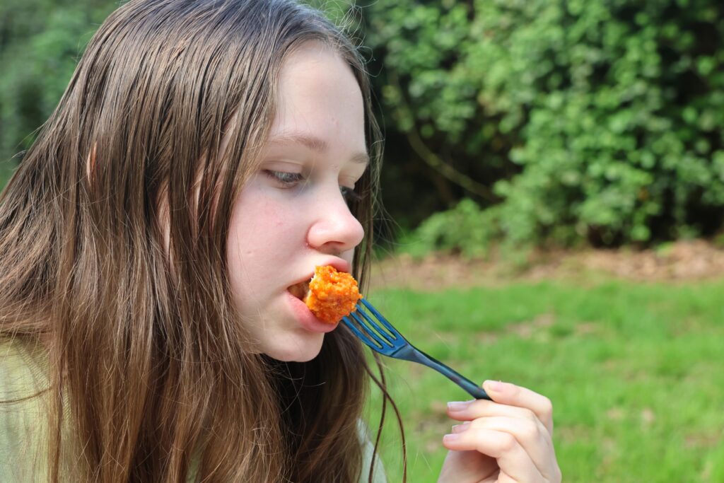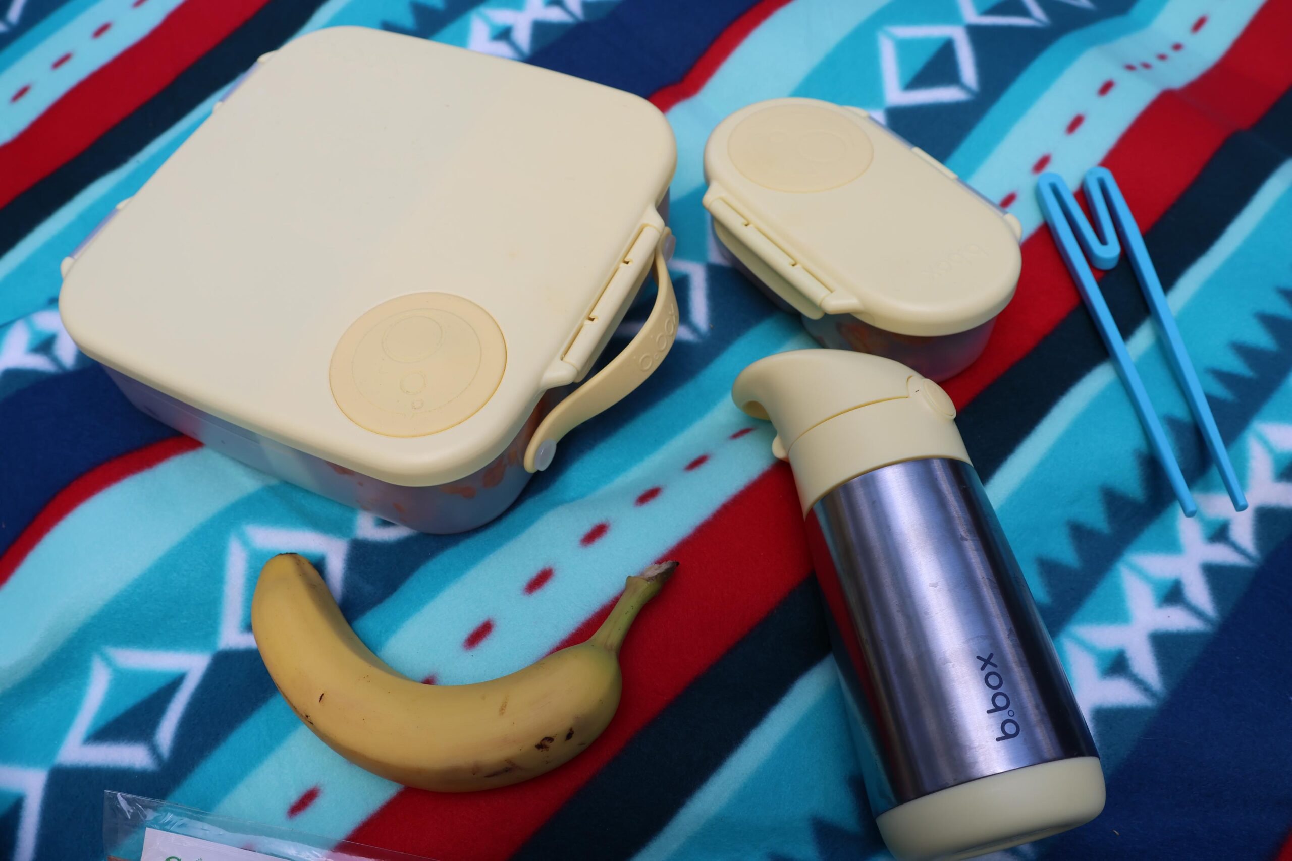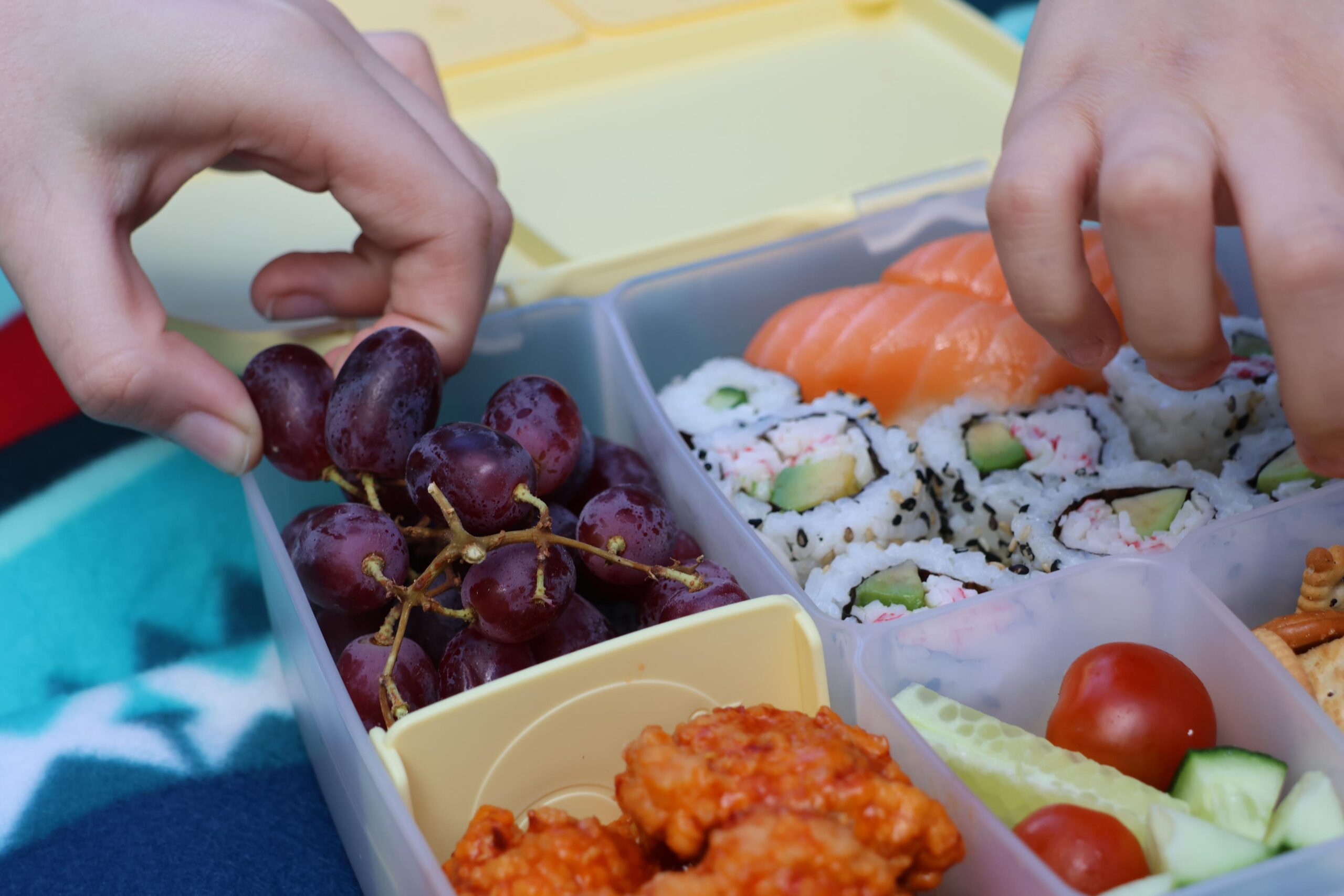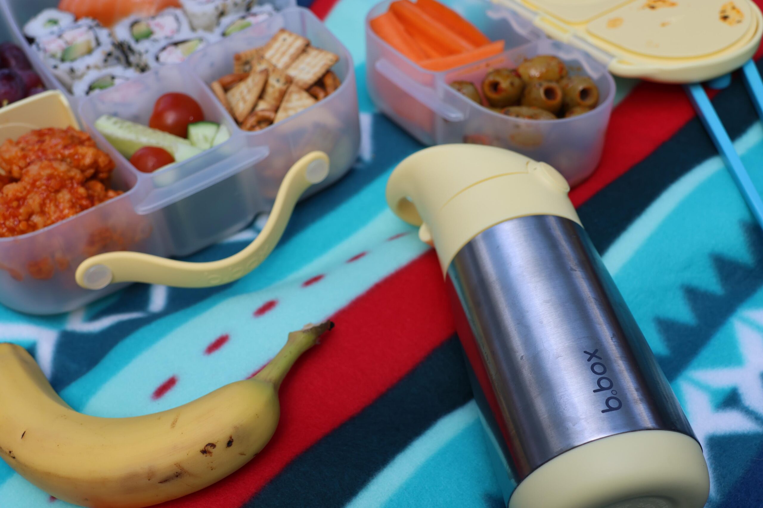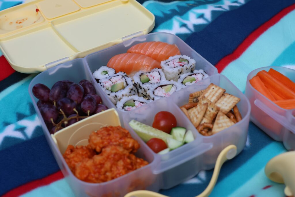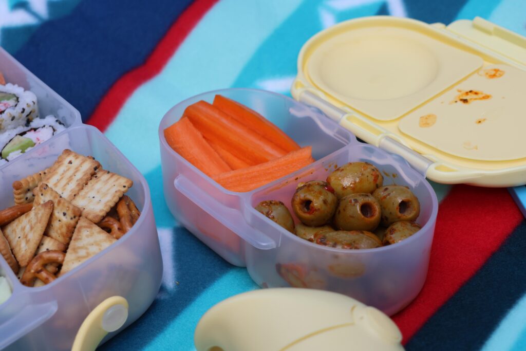 When we go on picnics, we try to make things as fun as possible! We often pack sushi, which is a big favorite in our household. The b.box lunchbox has a little tray that separates the ice pack from directly touching the food, which is perfect for filling that section with sushi. One side of the lunchbox has a slidable divider, which can also be removed, along with three further sections that all are drip proof (great for yoghurts and the like.) We filled ours up to the brim, grabbing the b.box snack box to add in a little extra snacks. I do feel the b.box snack box is perfect for a vegetable and a dip, but we aren’t a huge dip household, so we doubled up on some vegetables.