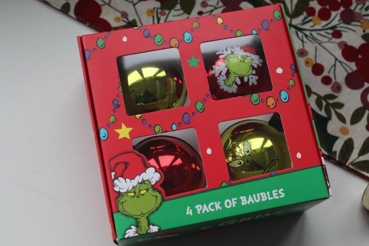 This pack of 4 grinch baubles include two with Grinch designs and two that are just red or green. The red Grinch design is my favorite, with the Grinch’s face and a snowflake behind it. He looks extremely grumpy on the green bauble as well. This is a cute, supplementary pack of ornaments that feel great for a Christmas tree set up, even if you do not have a completely Grinch tree.