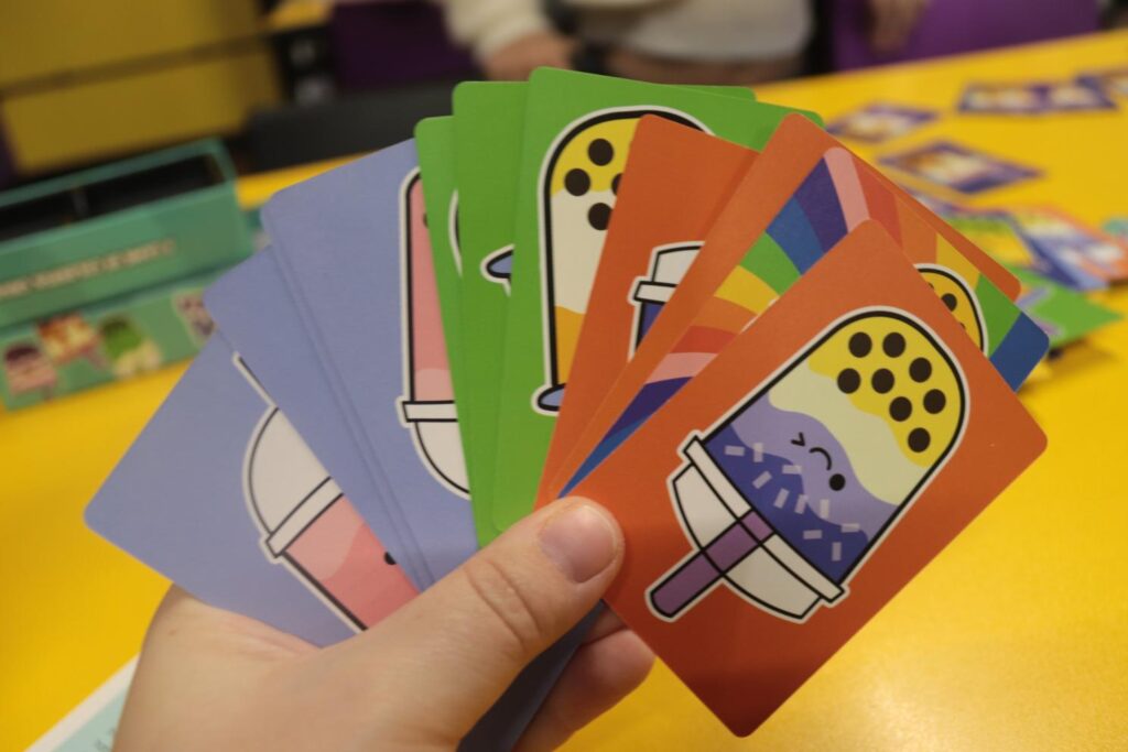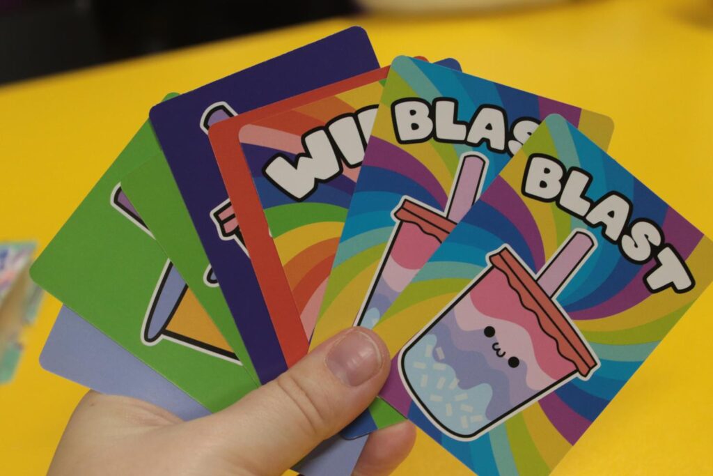 Once you’ve all decided all the cards are not useable, you will then swipe them from the side and start a new round, with everyone drawing again. Boba Bonanza feels very quick and the more players that you have the more hectic everything becomes. There are also two special cards to add more to the mix; a Blast It card that can cause all other players to scramble to put their hand on the Blast Card, with the last player to do so needing to discard their entire hand and start over. Wild cards work as any colored card, but you cannot use more than one Wild Card to complete a set of boba cards – which is the goal of the game. Once someone has eight duplicate cards, an entire order of Boba, placing them down to complete the game.