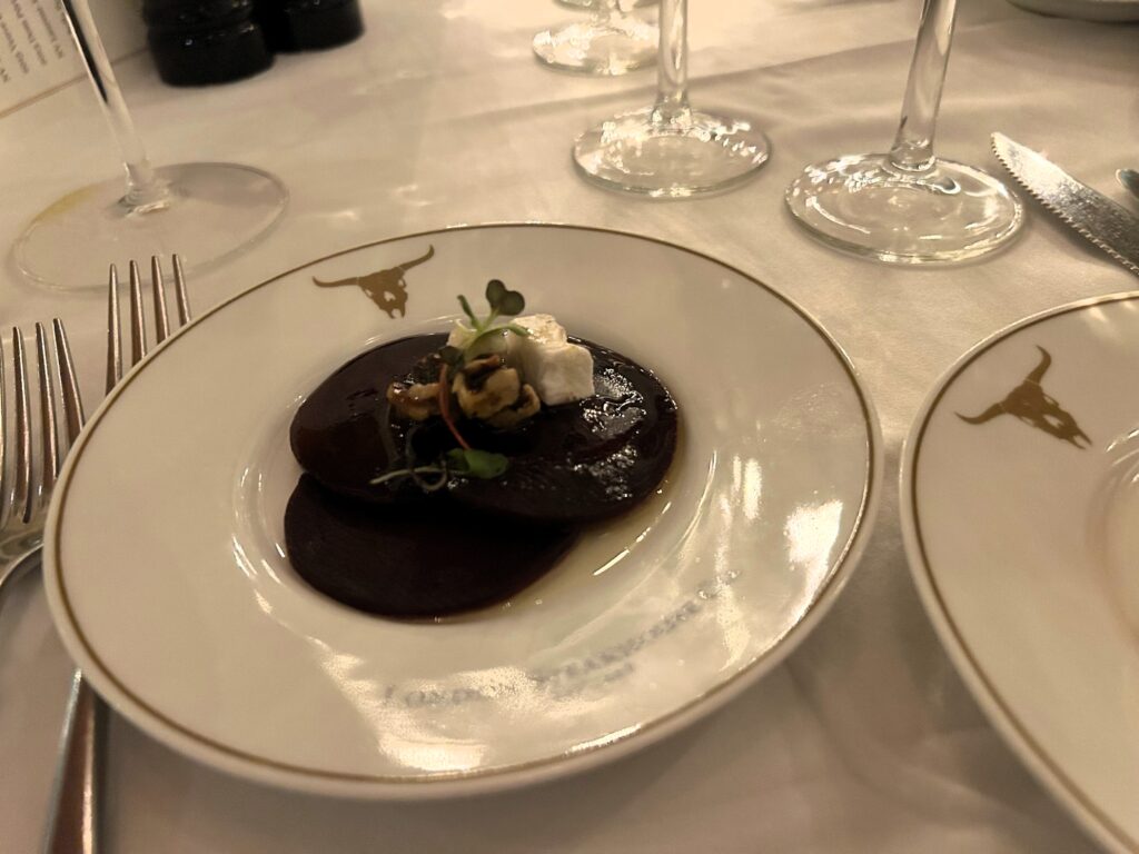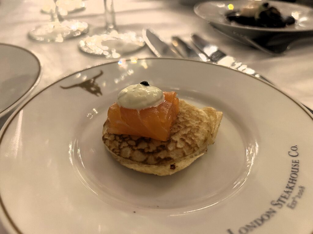 [Ad- gifted experience] Dann and I do love a romantic dinner out, and the six course tasking menu at London Steakhouse Company, by Marco Pierre White, is a fantastic, intimate, date spot perfect for Valentine’s Day. Dann and I have previously been to one of Marco Pierre White’s other restaurants, which had a more casual approach, so we were excited to try out this one as well. There was a doorman who took our coat, hung it up, and then we got seated. Their 6 course meal had a menu with a few set items and some items to choose from – and we also selected things from the cocktail menu. Now, it’s worth mentioning that the lighting here was quite dim, moody, and romantic. So, it was a touch challenging to actually take pictures, but we did very much enjoy our evening together.