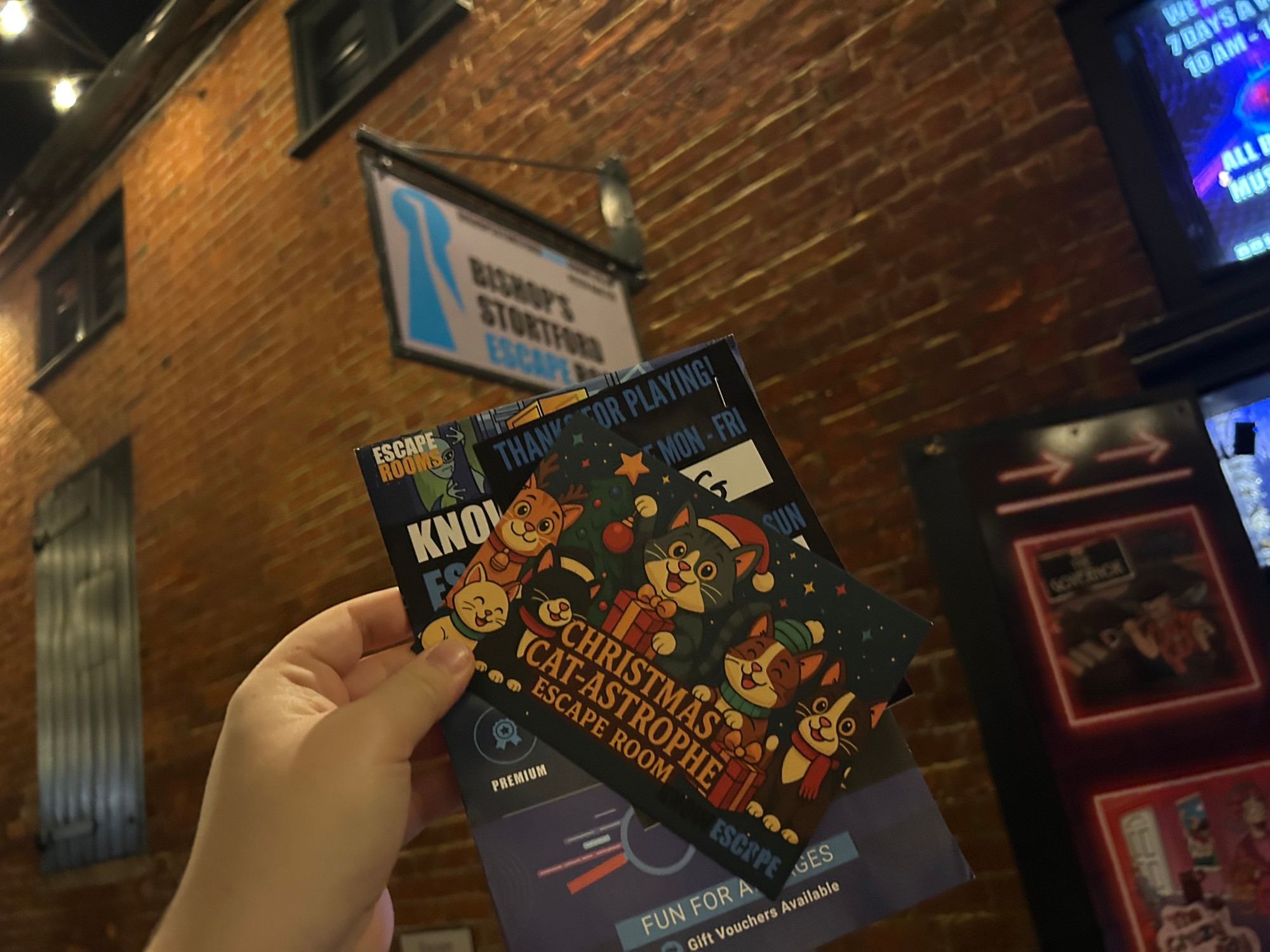 We finished Christmas Cat-Astrophe Escape Room at KnownEscape with nearly 12 minutes left, which felt like a real accomplishment. Everything sort of came together quickly at the end! We all enjoyed our time there, with Kai being confused on why some stuff wasn’t used yet was in the room and Amelia having a fantastic time solving a few of the more challenging puzzles. At the end of the game, they do take a Winning Team photo, which is then emailed to you, and you do get a time card at the end as well. It’s worth noting that the images that are shared to promote the Christmas Cat-Astrophe Escape Room at KnownEscape are AI generated art, which isn’t something we support, especially with how expensive escape rooms are!