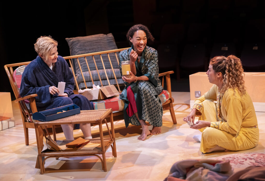 The stage transitions through the timeline with both costume changes, adding more furniture to the house, and through years being projected on the wall. At first, years move slowly as the girls have very high-highs and then go through some traumatic things together. Over time, however, they do need to move out and go their separate ways. Di and Viv and Rose doesn’t stop when they all move out, and instead they continue their separate lives, with us seeing glimpses that are more spread out. They meet up a few times, seeing how they all have changed, but their lives are in completely different directions.