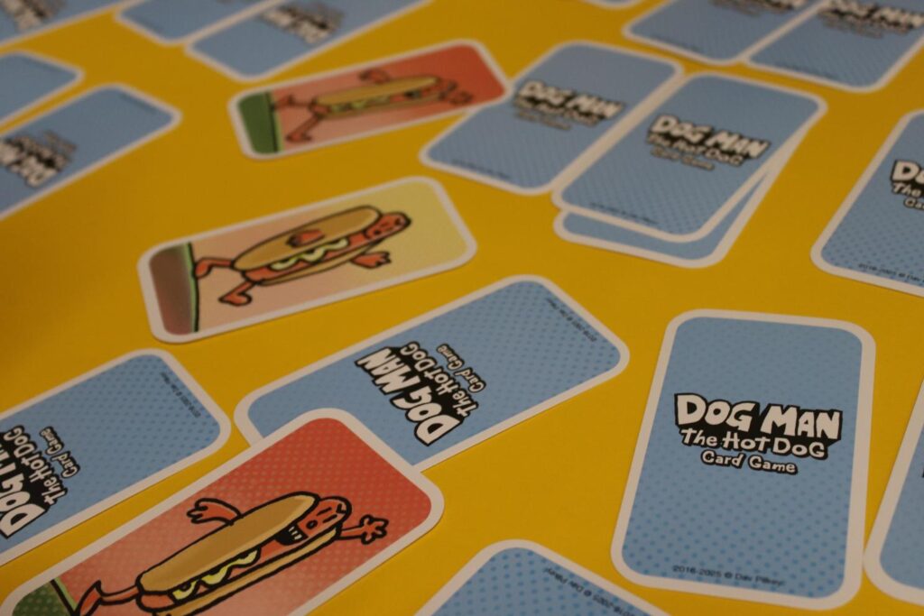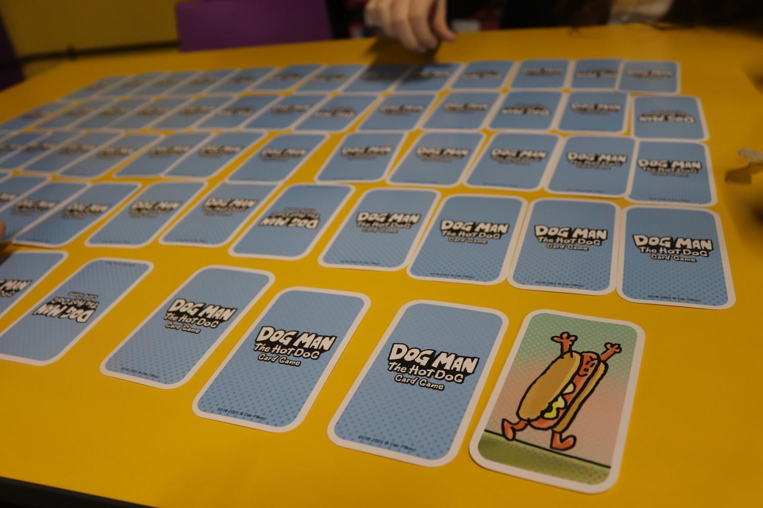 Essentially, all of the cards need to be shuffled out and displayed out on a big table. You do need to make sure that you have a lot of playing space for this card game, as we took up a large table of four and it was quite chaotic. When all of the cards are spread out, you then start to play the game! Each player takes a turn flipping over one card. If this card is a hot dog, which they primarily are, nothing happens and it stays face up. Then, the next person goes. If Petey the Cat gets turned over, all of the face up hot dogs need to be put face down. If there are no hot dog cards, then Petey goes into discards. If Dog Man is revealed, all players must scramble to grab hot dog cards! This is done with one hand, grabbing and placing one into your score pile, until all revealed cards are played.