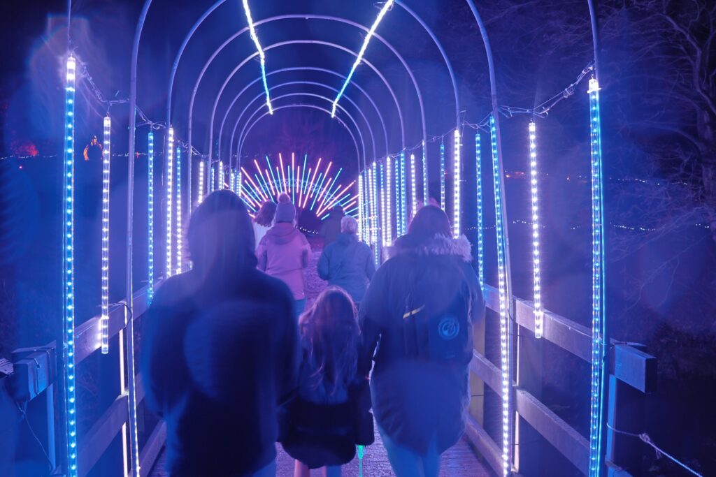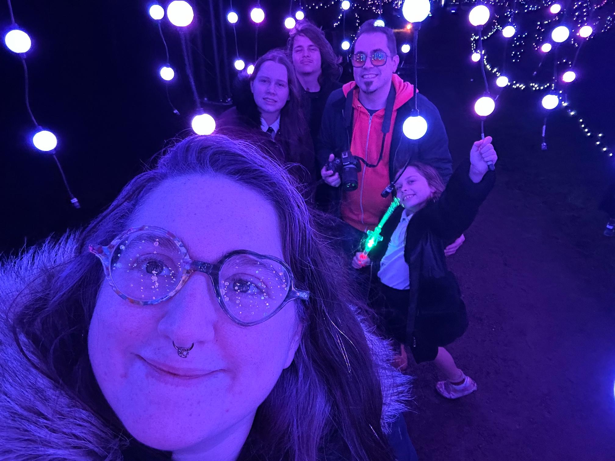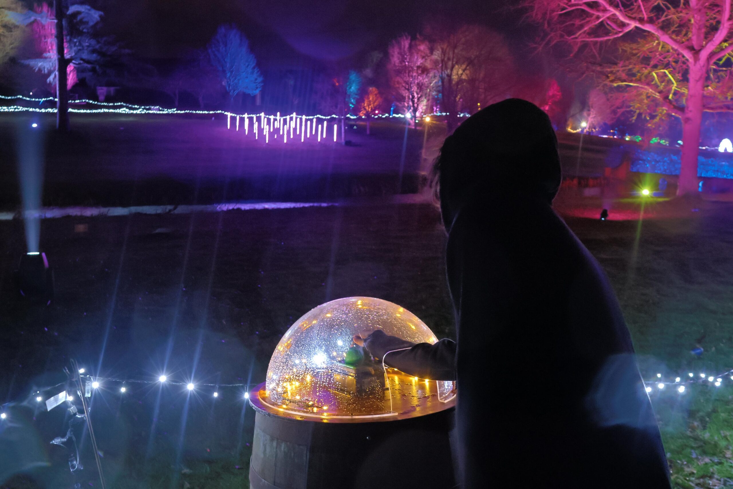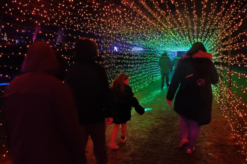 There is a large arch at the start of Markshall Estate, which is beautiful and well lit, before walking towards the classic Enlightened letters, that dot around. There were quite a few lights before we hit the talking tree, who welcomed us to our walk and told us what to expect. You can sort of see the light trail in front of you, as there isn’t tons of forest at Markshall Estate, and there is a giant pond that’s absolutely stunning along the way. With that in mind, Enlightened does a great job with the space; there are three different light trails (triangle one, square one, and the classic light up long one), as well as hanging balls – though the balls were a bit tall for some of us. These are classics and often you see at least one of them, but it was great to see all of them.