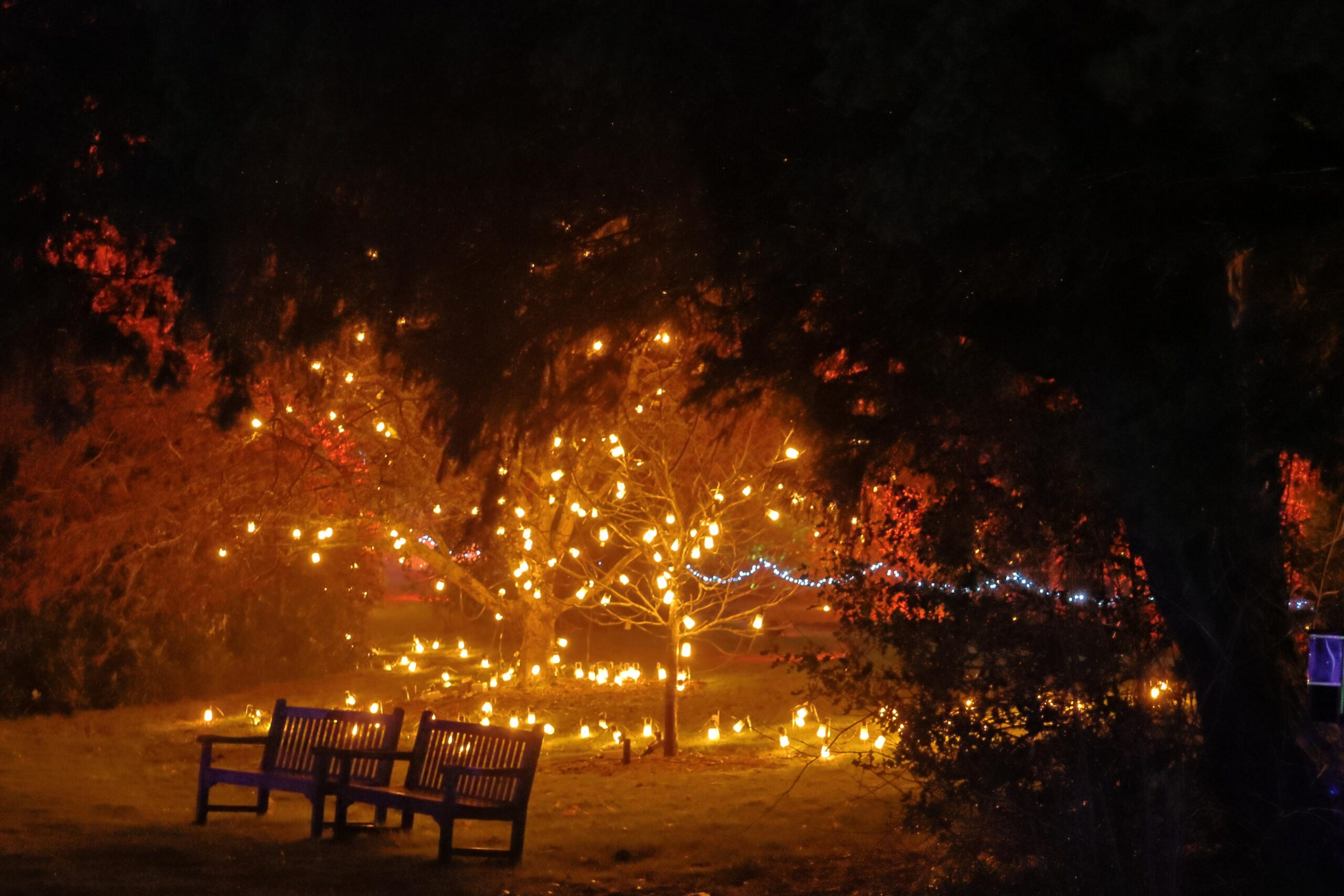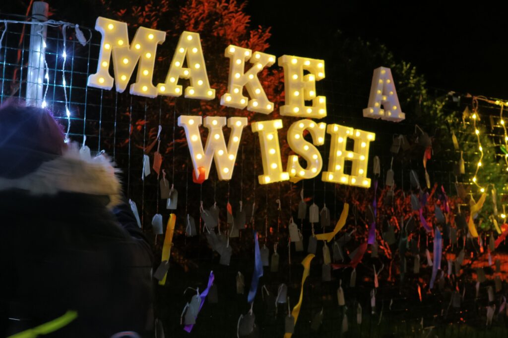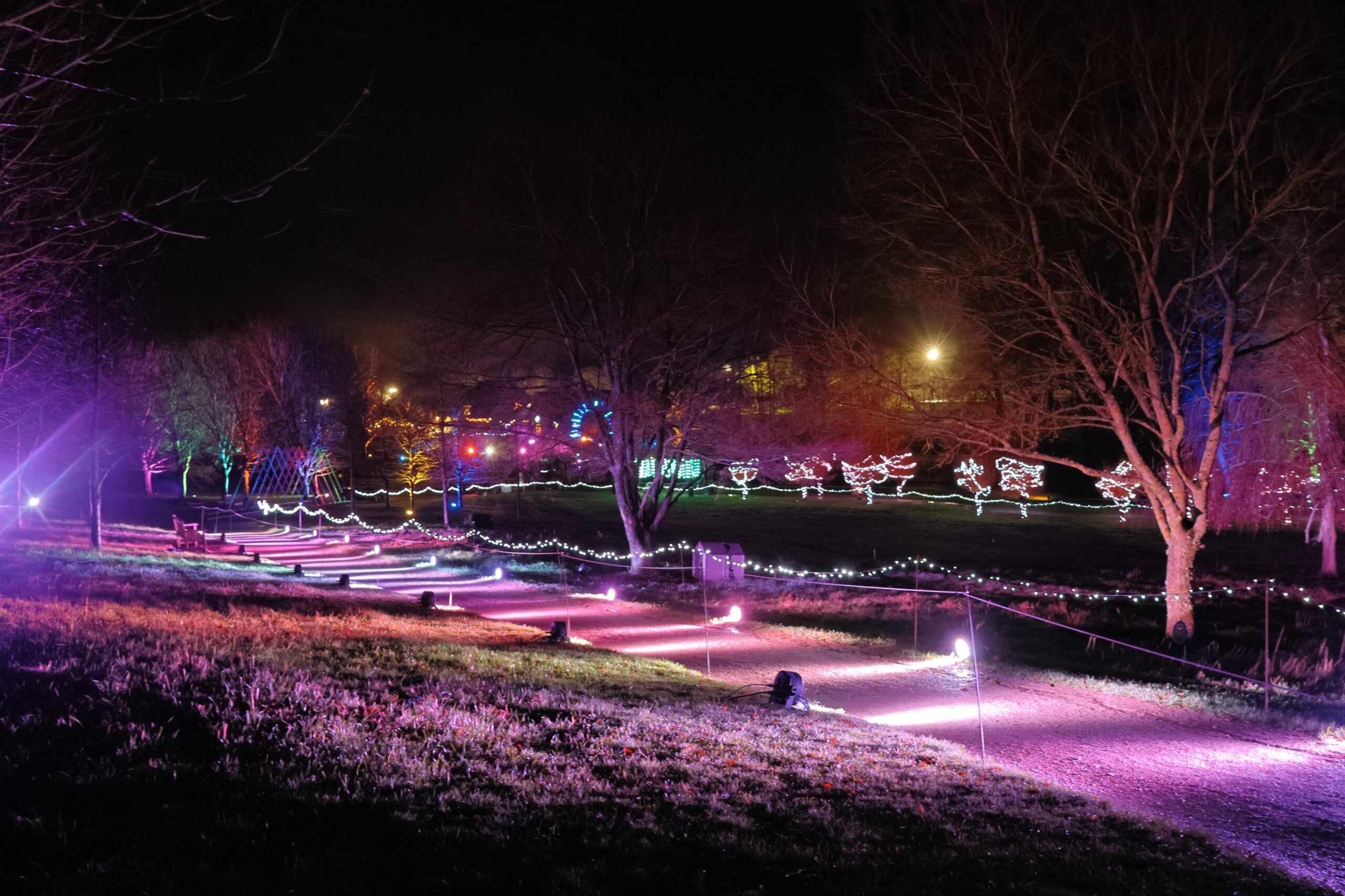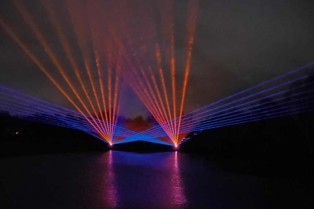 There is a large arch at the start of Markshall Estate, which is beautiful and well lit, before walking towards the classic Enlightened letters, that dot around. There were quite a few lights before we hit the talking tree, who welcomed us to our walk and told us what to expect. You can sort of see the light trail in front of you, as there isn’t tons of forest at Markshall Estate, and there is a giant pond that’s absolutely stunning along the way. With that in mind, Enlightened does a great job with the space; there are three different light trails (triangle one, square one, and the classic light up long one), as well as hanging balls – though the balls were a bit tall for some of us. These are classics and often you see at least one of them, but it was great to see all of them.