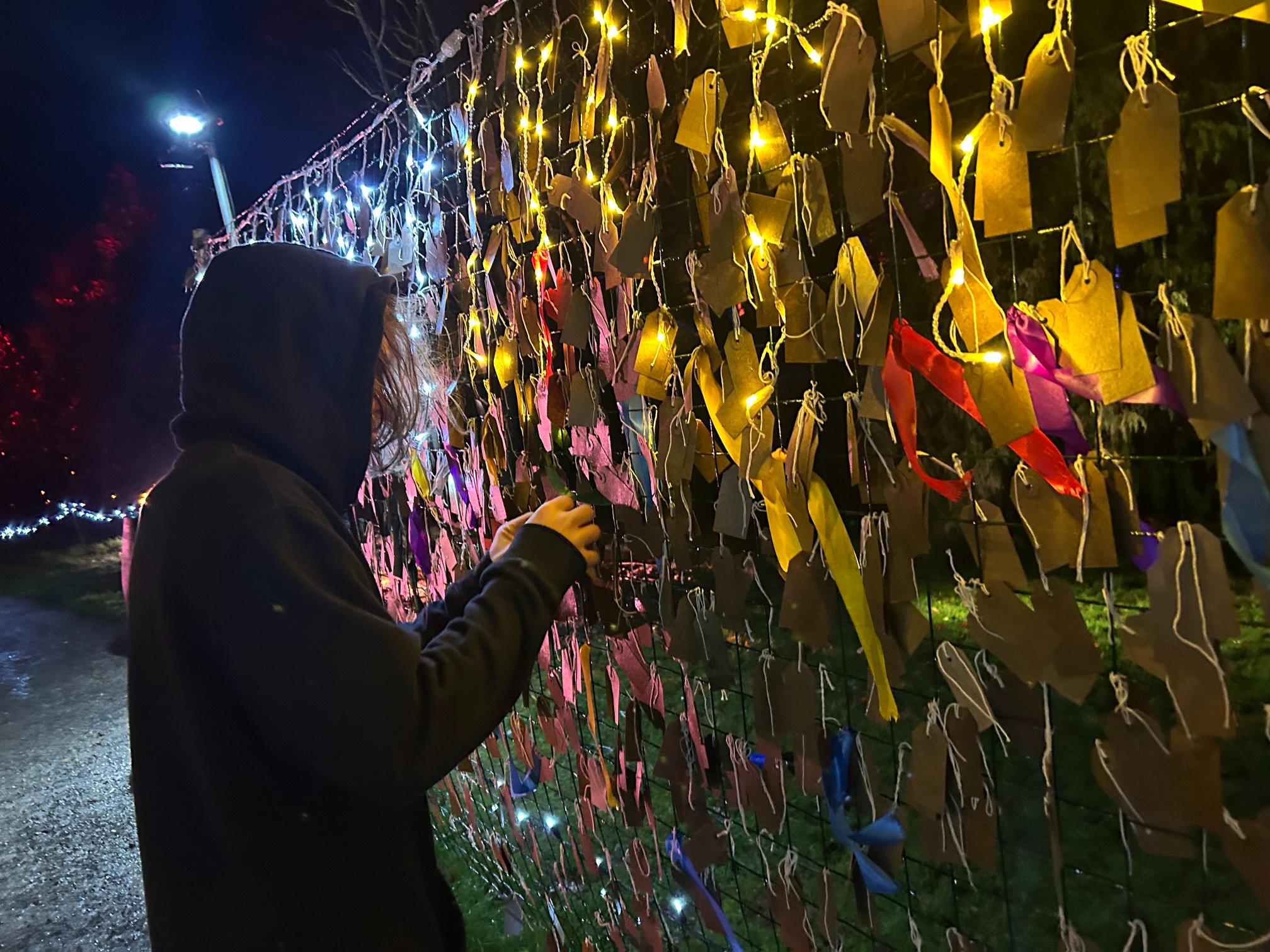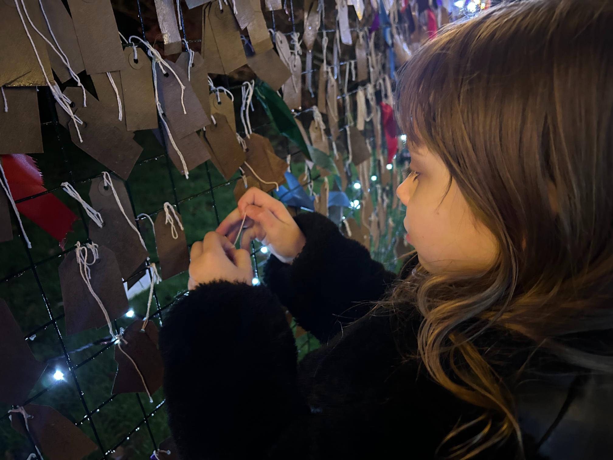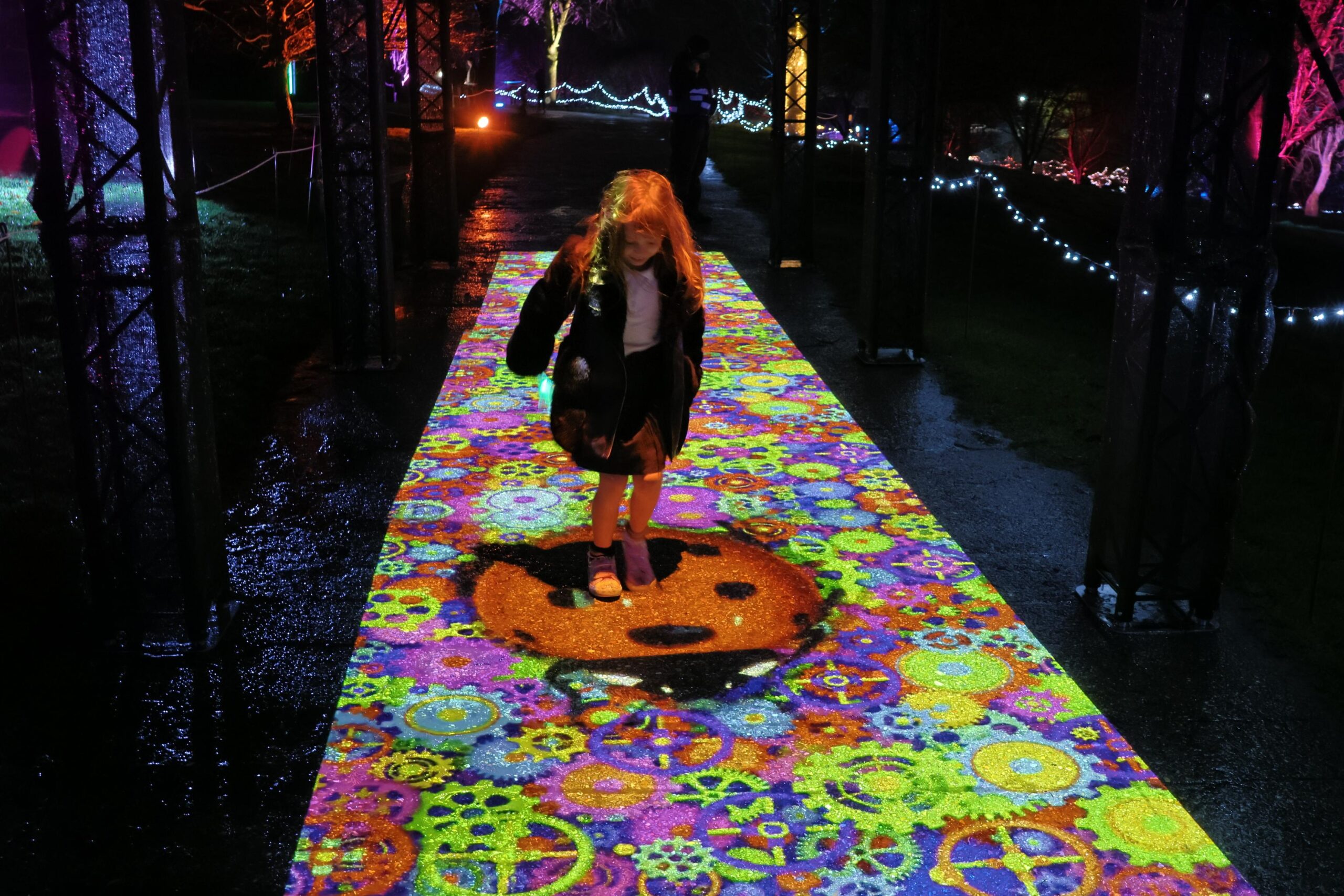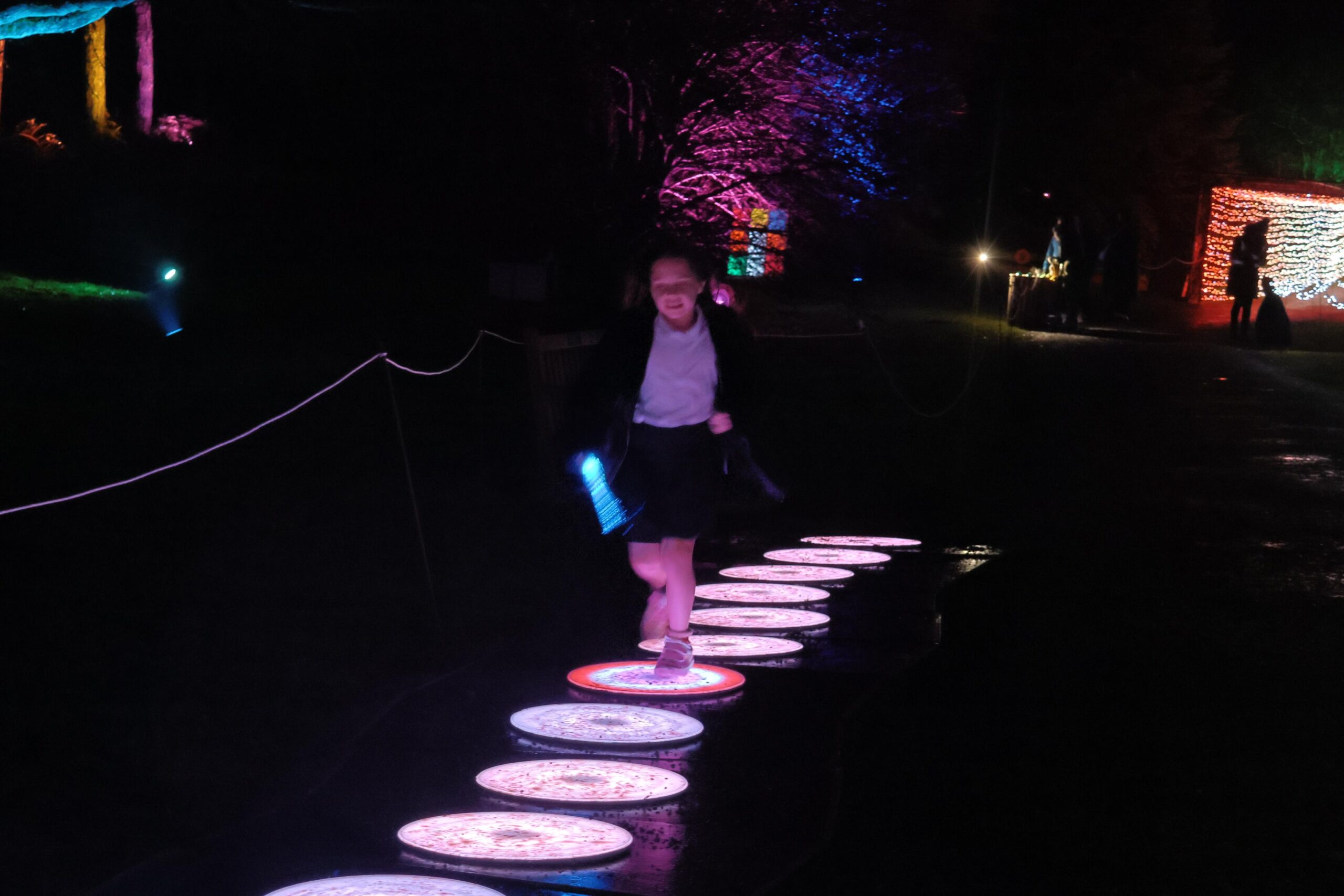 Markshall Estate had a few interactive points, one being a game where you needed to stop a green light on top of a pillar that had a red light, which Amelia was fantastic at. There were spotlights that could be moved about, the spots that you can run on to change their color (which is Robin’s favorite, and she ran across no less than five times as there weren’t many other people attending at our time slot), and there was a new interactive which we hadn’t seen before. A giant Rubix cube, with two sides showing, challenged people to change all the colors so they were the same before a timer ran out. Amelia understood how to play quickly and completed it, which was great! We also made wishes and hung them on the wish wall, before reading through some of the others there, and continuing on.