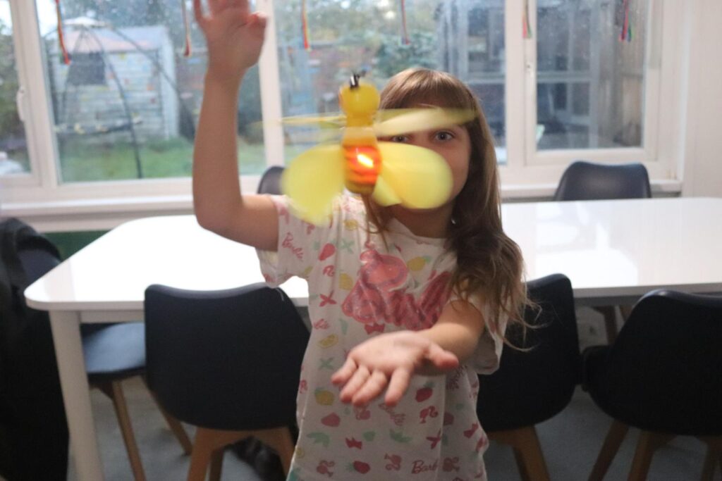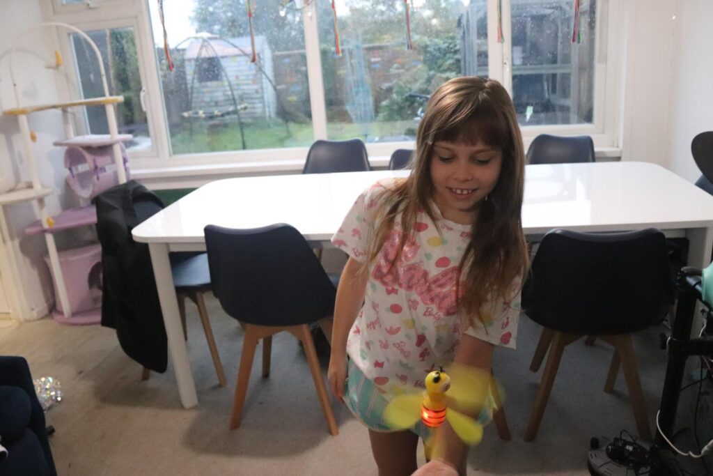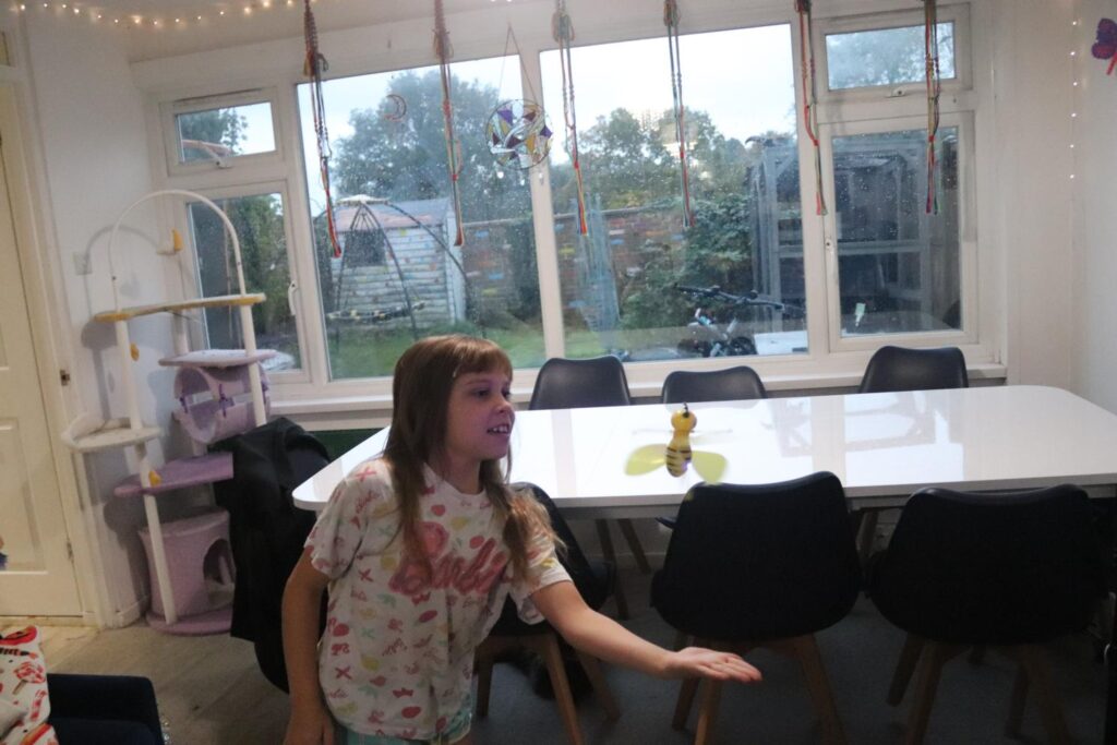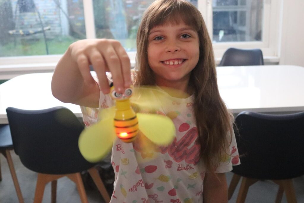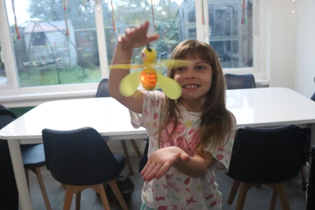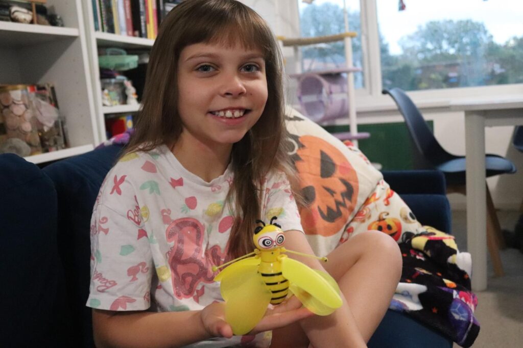 There is a small switch on the Flying Bee that you need to turn on – which we do while holding onto the bee’s head. This is to ensure it doesn’t fly off before we are ready. Then, by putting your hand underneath the bee, it will start to lift off. Smaller movements are key, though Robin tends to chase it around, trying not to let the bee hit the ground (which it just does hover above anyway, but this is still a fun game to her). There are a few different antenna-like things that hang off of the bee, which when they hit a surface or something similar, the entire thing stops flying.