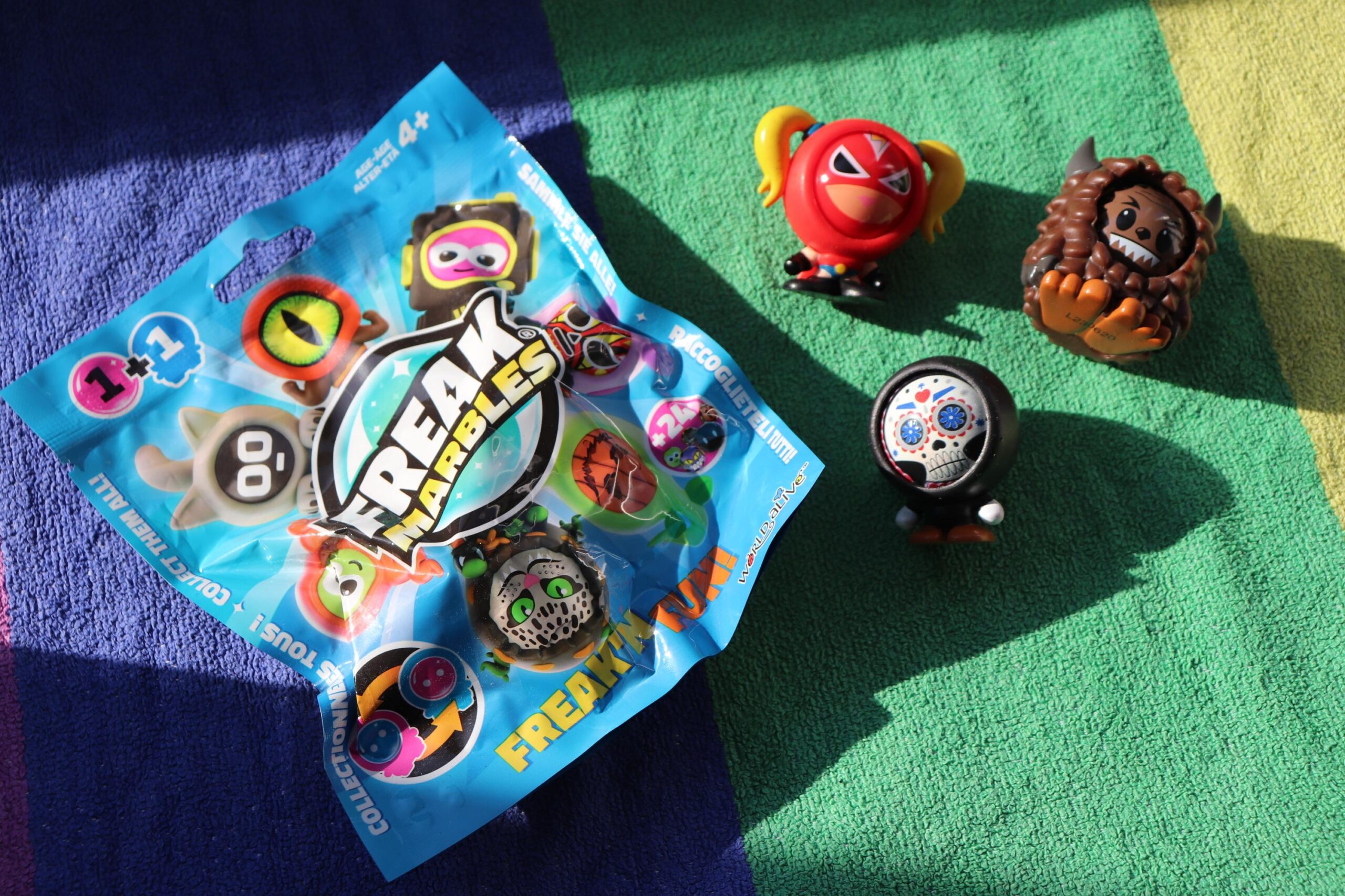 Freak Marbles have brought characters, blind bag mystery, and different games to the marble world. Robin got the chance to open a starter pack of three characters that you can sort of see already, which includes a draw-string bag to hold all of your Freak Marbles in, along with one of the blind bags which contains a marble and their outer skin. These skins are all showcasing a different creature, character, or thing, where as the marble itself slots in as the head of the creature.