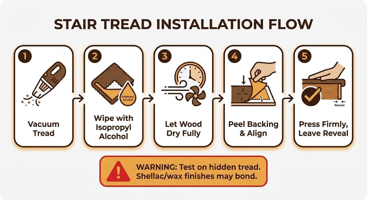 Correct installation starts with a clean, dry surface. Vacuum each tread, then wipe with a microfiber cloth dampened in isopropyl alcohol to lift any polish residue that would prevent adhesion. Let the wood dry fully before peeling the backing.