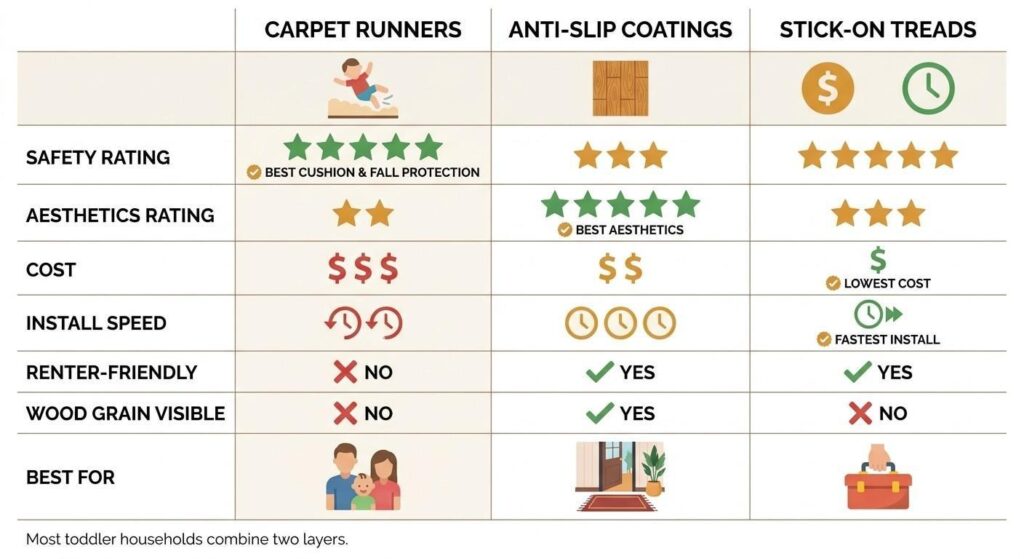 Comparison chart of carpet runners vs anti-slip coatings vs stick-on stair treads for toddler safety on wooden stairs, rated by safety, cost, aesthetics, and renter-friendliness