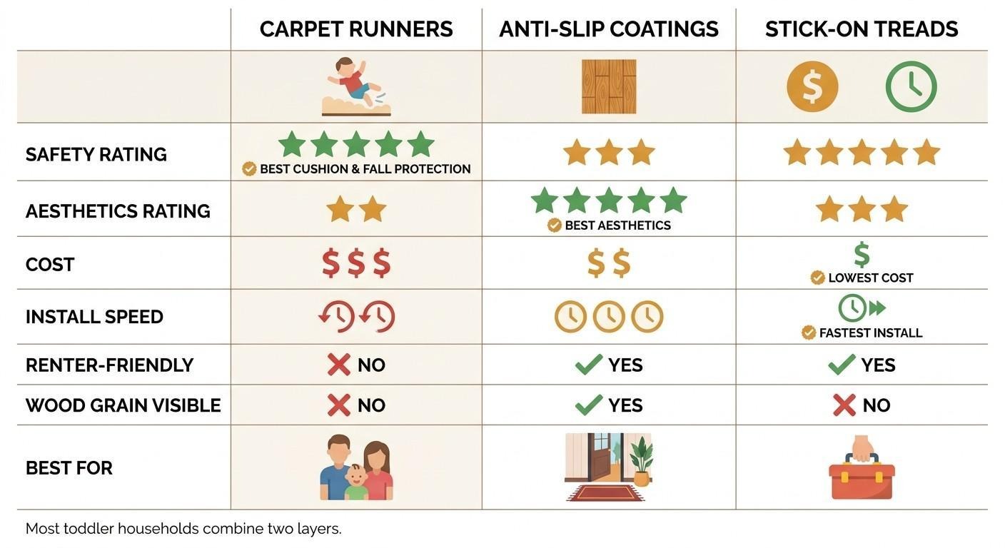 Three solutions dominate toddler-proofing: carpet runners win on cushion during a fall, anti-slip coatings win on aesthetics, and stick-on treads win on speed and cost.
