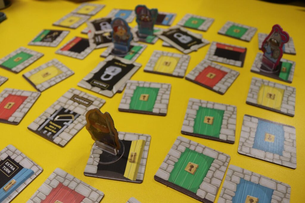First, you need to make the castle from the game. This is done by creating a grid of different closed door tiles. The size of your grid depends on how many players you have playing. The doors are all different colors and with them closed, you cannot see what’s on the other side. They have to be unlocked, using keys of a matching color or skeleton keys, so that you can then go through that tile. There are a few other card types; passageways to allow your character to move diagonally between two doors, padlocks that can be placed on doors, so a player needs to use a skeleton key to open them. Some of the doors have a barred side, which means they cannot be walked through. You will need to use a saw to open them back up. Other doors have bonuses like an extra key or an extra turn, so there is a lot of variety to the map itself.