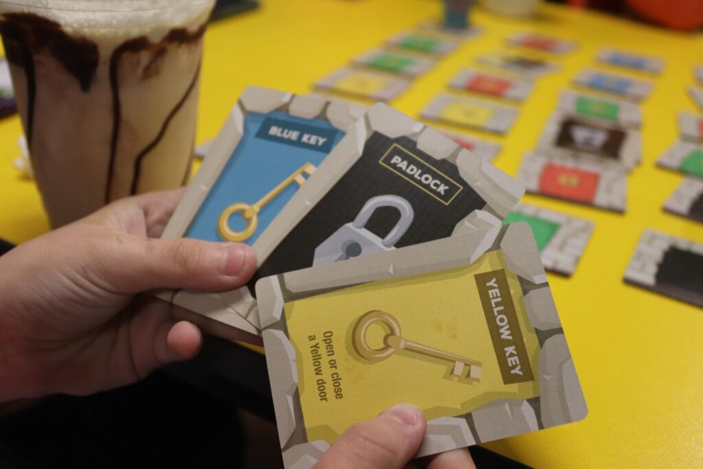 There are a bunch of different characters that you can choose from in Keys to the Castle, which is a fun little bonus. Before starting the game, each player picks a side of the board for their character to start at, and they will be working their way to the other side. Turns have the player drawing a card to their hand of three cards, playing a card, and then (optionally) moving one tile if they can. It’s a quick turn, but there is a lot of chaos that can be caused through putting down padlocks or using keys to re-lock doors someone else have opened so they can make it through.