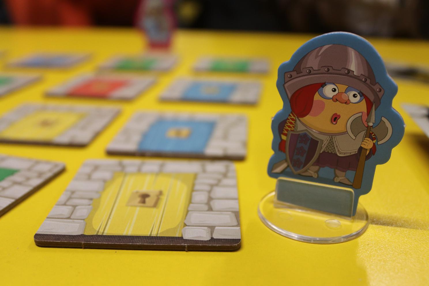 First, you need to make the castle from the game. This is done by creating a grid of different closed door tiles. The size of your grid depends on how many players you have playing. The doors are all different colors and with them closed, you cannot see what’s on the other side. They have to be unlocked, using keys of a matching color or skeleton keys, so that you can then go through that tile. There are a few other card types; passageways to allow your character to move diagonally between two doors, padlocks that can be placed on doors, so a player needs to use a skeleton key to open them. Some of the doors have a barred side, which means they cannot be walked through. You will need to use a saw to open them back up. Other doors have bonuses like an extra key or an extra turn, so there is a lot of variety to the map itself.