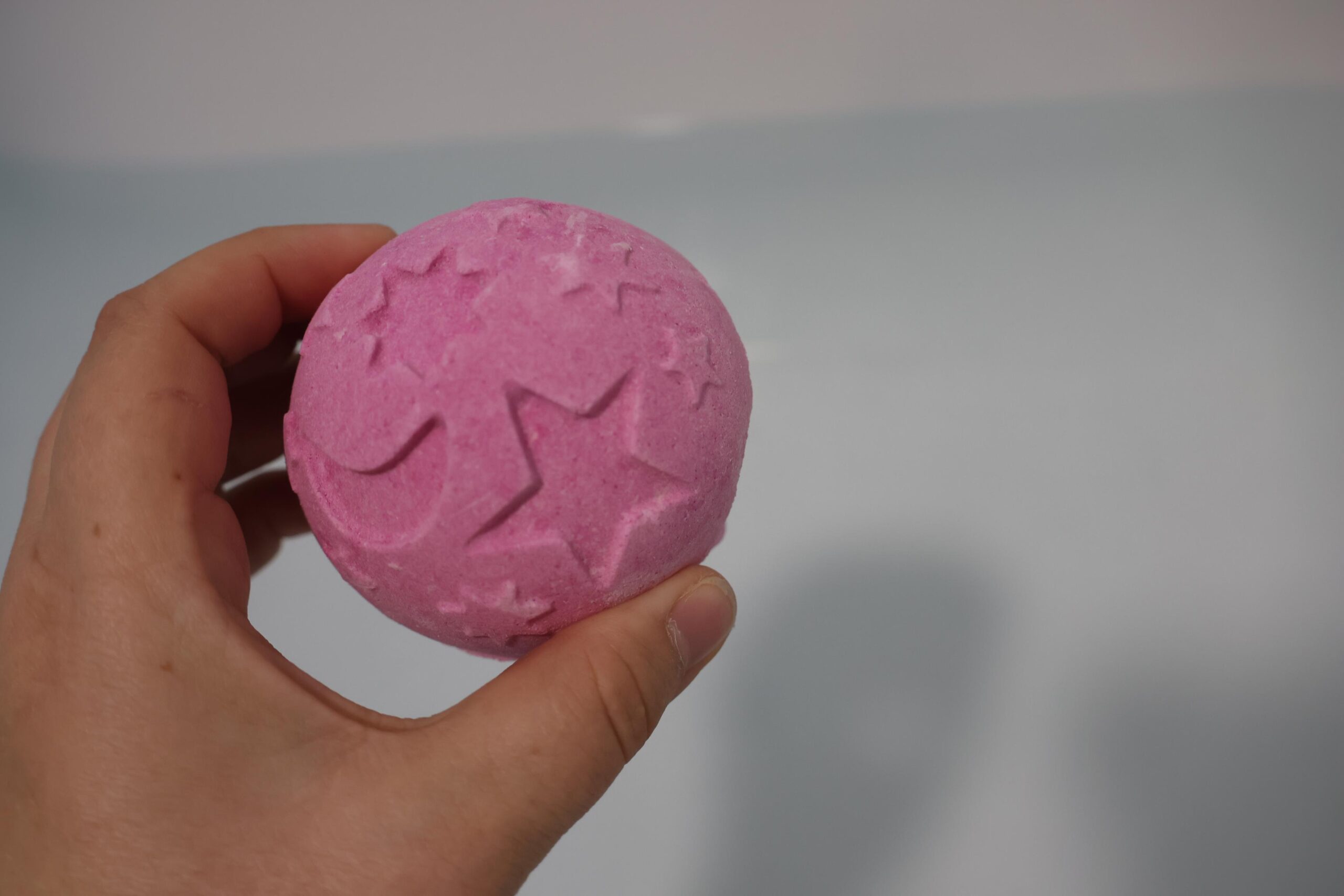 I was first drawn to this bath bomb due to the stars and moons that are printed on it. It’s a one-color, pink bomb, that has a blue centre to make a purple foamy bath when it’s all dissolved. The bomb itself has lavender oil, but isn’t overwhelming as there are scents of vanilla alongside it. The scent does last quite a while, so if you like long baths, you’ll still enjoy lavender and vanilla. The LUSH Twilight Bath bomb is quite a relaxing, soothing one.