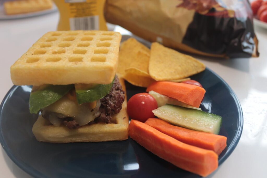 We had some friends over so made chaos burgers. These were cheese burgers inside a potato waffle bun! It’s so fun to have something a little bit different. I did vegetable sticks and tortilla chips on the side, along with more potato waffles. This went down well with all of the children and was so easy to make too.