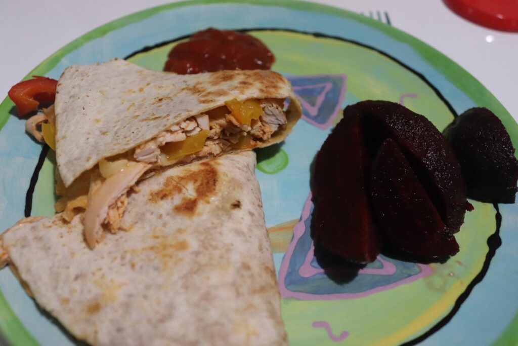 We do quesadillas from time to time, but wanted to make them more filling for dinner. I cooked up some chicken breasts, shredded them, and added them, and mixed in some pan-fried bell peppers. I also added in fajita seasoning. Then, took tortillas, sprinkled on cheddar cheese, and added in the filling. These were served with guac, salsa, hot sauces, and some boiled beets. This is one of our staples, really.