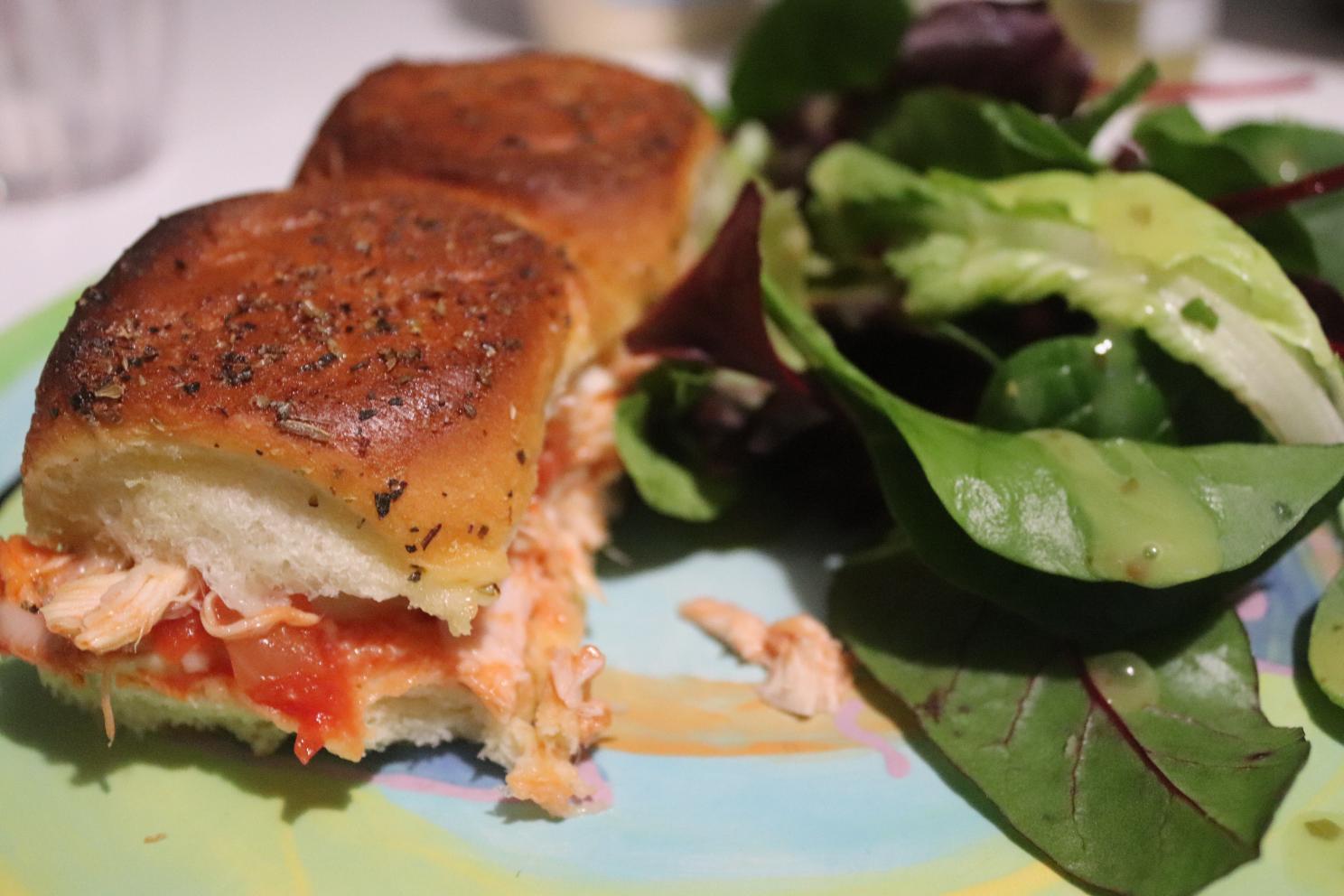 When I was at Costco, I saw the Hawaiian rolls that use to be super popular on social media! I was super excited, so grabbed some. We used a rotisserie chicken, shredded and mixed with some jarred tomato sauce to create these chicken parm sliders. I then placed them into the bread, added some mozzarella on top, and based the top of the bread with some butter, garlic powder and Italian seasoning. These were then baked until toasty! It felt very American, and we all really enjoyed them. I also served a side salad.