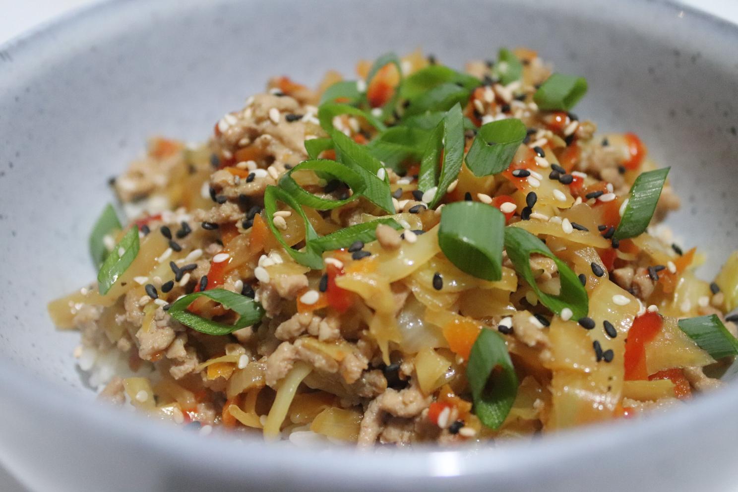 Egg roll in a bowl was back on the menu! This is a minced pork dish, with cabbage, peppers, grated carrot and onion fried up with it. For the sauce, we added in grated garlic, some soy sauce, and sesame oil. I served this over rice, with spring onions from our garden (still going strong) and sesame seeds. It’s easy, filling and delicious.