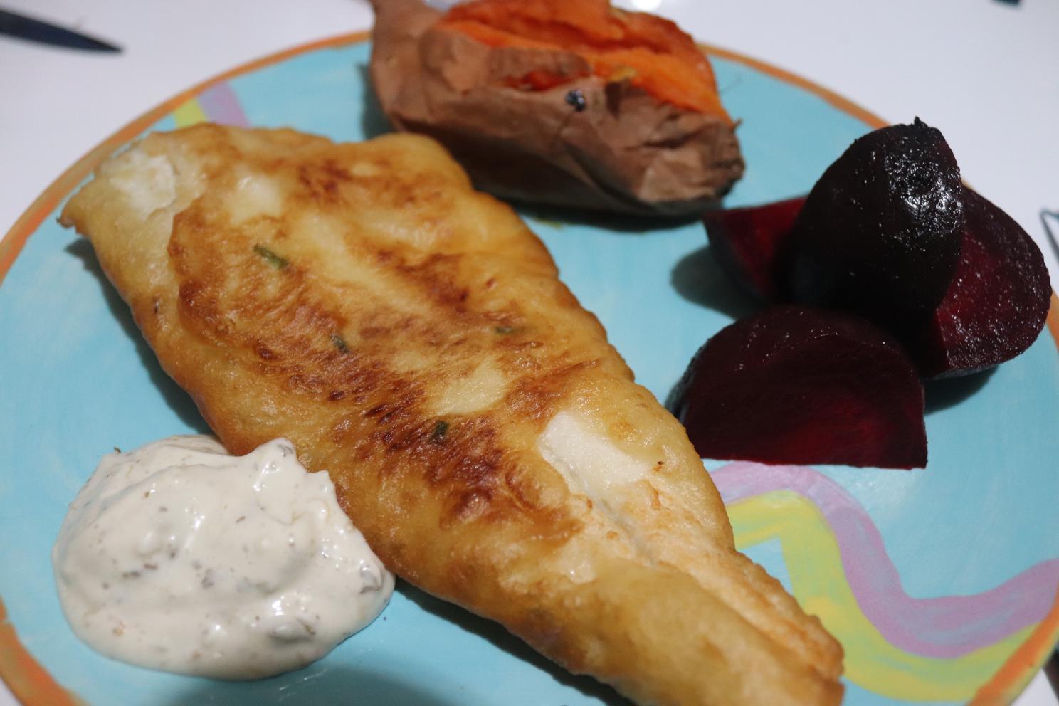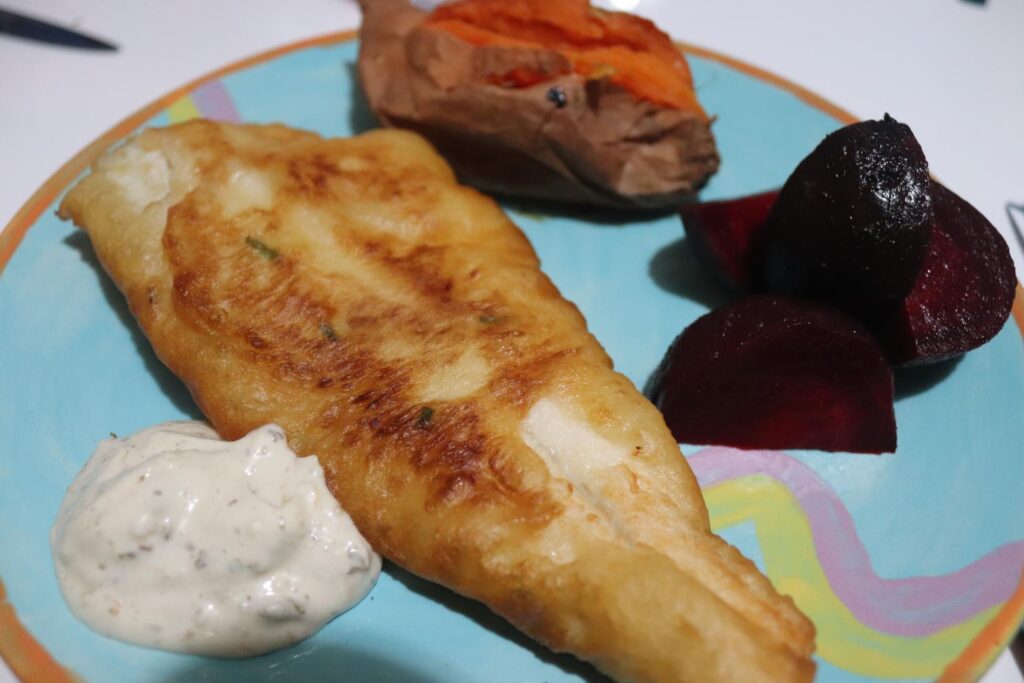 I must say, I love it when Amelia cooks dinner! She is at an age where when she asks to make battered fish, she then just goes into the kitchen and makes it. This was a beer batter that was equal parts beer and flour, in weight, along with some chives. She fried sea bass in vegetable oil, and it was served with sweet potato and the rest of the beets. I also had some tartare sauce on the side of mine.