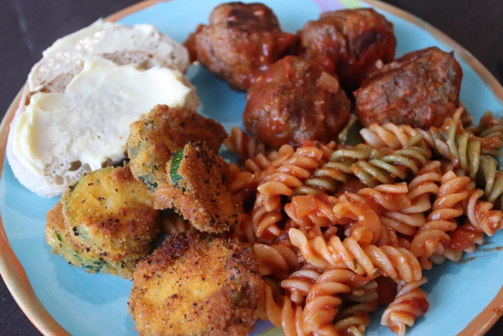 Growing up, we always had meatballs! Zucchini is in season, and the best way is breaded, so we decided to make some beef meatballs, which is a mix of beef, tomato paste, Italian herbs, bread crumbs, egg, and parmesan cheese. I pan fried these before baking them off in the oven. I breaded and fried some sliced zucchini, which was Amelia’s favorite thing ever and now what she asks for, for breakfast each day, and cooked up some pasta. We did use our favorite jarred sauce to tie it all together, finishing the meatballs off in some of the sauce. I also buttered some rounds of bread to go with it. This is such a filling and delicious meal.