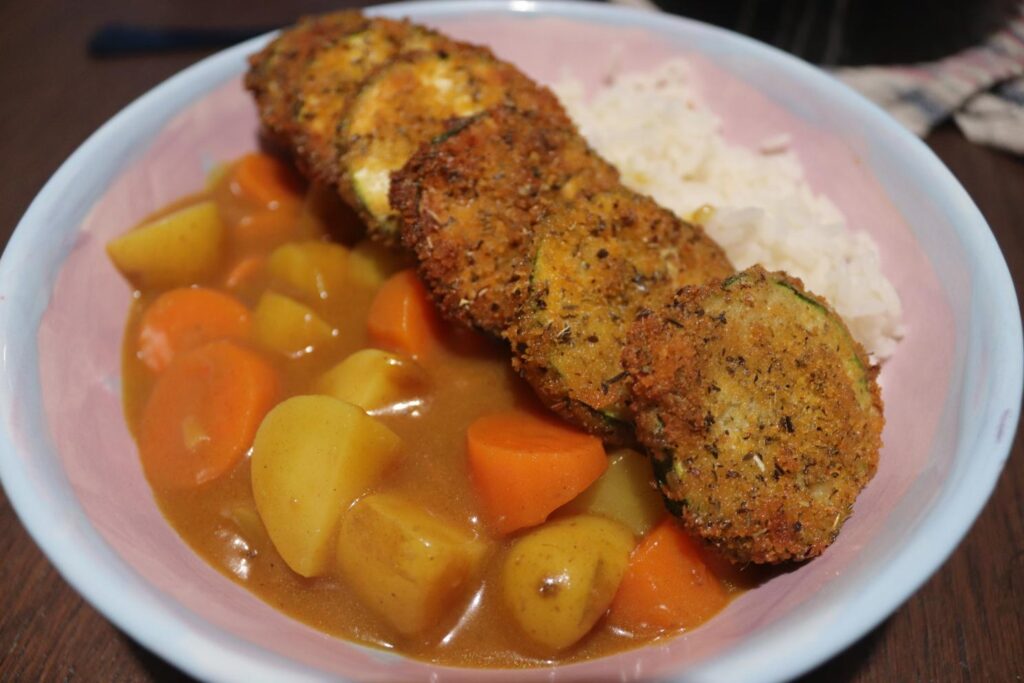 I did not get a picture of the Katsu Chicken Curry, but as I have cut down on my meat consumption, I had mine with fried zucchini. To make the curry, I cut up onion, carrot and potato and fried it off. Then, I added in the curry cubes and water, letting them cook off until it thickened. I made some rice to go with it! For the chicken, I butterflied chicken breasts, then did a flour, egg, and panko bread crumbing, which Amelia and Robin helped with, before frying them in oil and baking them to finish in the oven. For the zucchini, I used the same bread crumb method, but with Italian breadcrumbs instead of panko. I also cooked some rice to go with it.