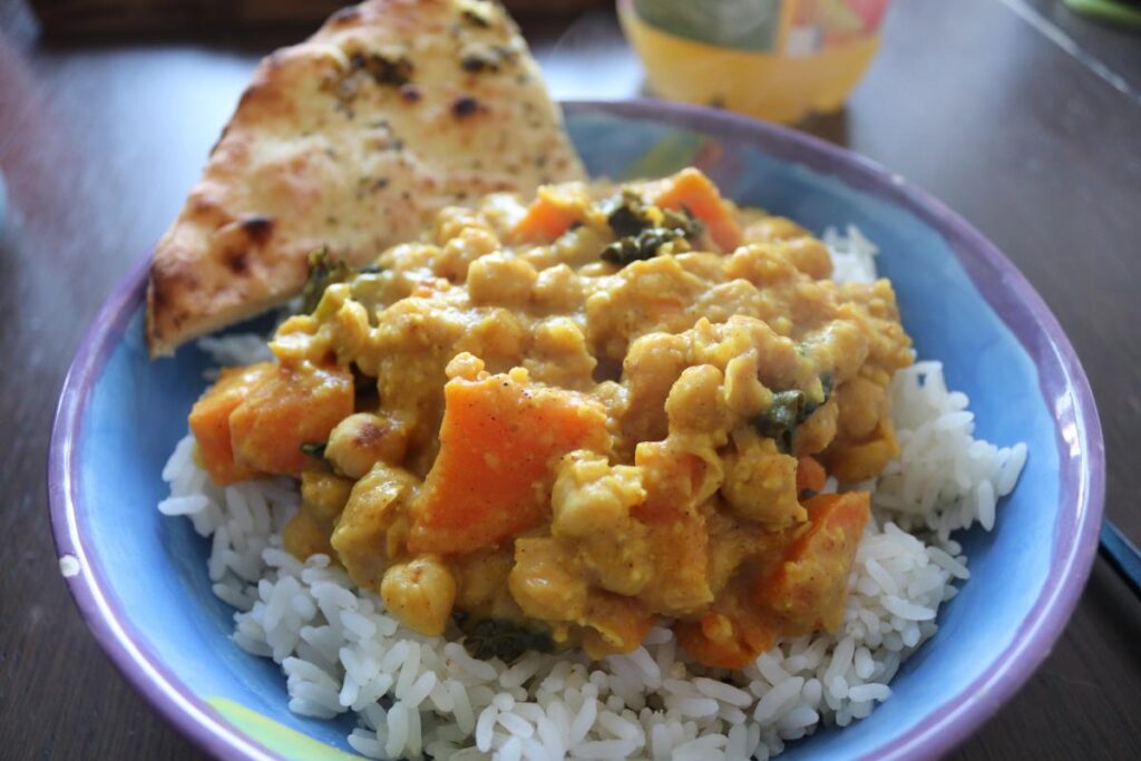A bit more playing around with sweet potato, I made a sweet potato and chickpea curry with spinach. This was a very simple meal – I peeled and chopped up some sweet potato and boiled them until nearly cooked. In a pan, I cooked off some drained and washed chickpeas until they were toasty. I added in the sweet potato and then added a jar of our favorite curry sauce. I let these all cook together while some rice was going. Right before we were ready to serve, I added in a handful of spinach to finish it off! We had this with naan bread.