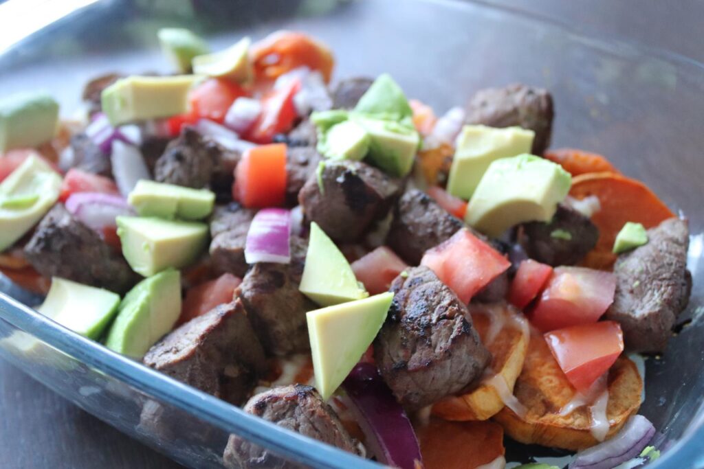 We are playing around a bit more with sweet potatoes for the summer, and one of Dann’s favorite sweet potato dish are these “sweet potato nachos” that I made up once, ages ago. I basically peel and cut a bunch of sweet potatoes and air fry them until soft but with crispy bits. This is the nacho chips to our nachos. I then top them with cheese and let that warm up in the oven a bit more. Once the cheese is melted, I put on tomatoes, red onion, avocado and some steak tips. These are just chunks of steak cooked in a bit of oil, salt and pepper. It’s a fresh feeling and delicious meal, which Kai really enjoyed, as it was in line with his fitness goal and very “clean”.