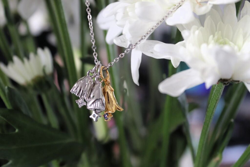 The first necklace I selected from their collection was the Honeycomb Pendant Necklace, which has a sort of honeycomb design with a little bee on it. This feels like such a fantastic idea for showing off birth flowers. There are a few different designs based on how many flowers you would let to add to it, with sixteen being the max that can be added to the necklace. I got my children, Kai, Amelia and Robin’s birth flowers on this piece, with them in age order across the necklace. Callie made it very easy to customize the piece; you can pick between brass, silver and gold as the base color (I picked gold because of the honey look), then you can select the various flowers, listed with their birth months, and the chain size. The Honeycomb Pendant Necklace looks really cute and colorful with all of the little flowers on it. Amelia and Robin found this to be so adorable as well!