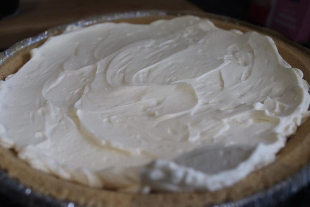 Once I had the cheesecake filling made, I then put it into the graham cracker that my dad has sent me. These are really easy to find in America, but I have never found one in England. You could easily use one of the pre-made tart crusts, that they have at supermarkets here, but it won’t have the same texture as a biscuit base. I then put everything into the fridge to set before our dinner party! We have a tabletop group that meets every single week, rotating who cooks dinner, dessert, and who brings soft drinks for everyone; and this time it was my turn for desserts!