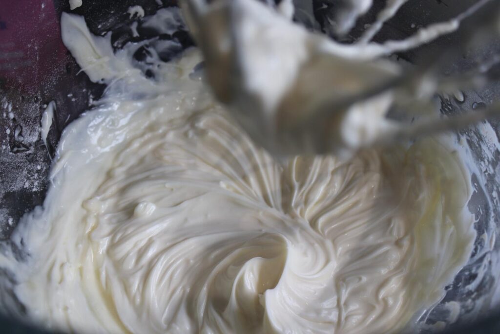 - Take your double cream and put it into a mixer with a whip attachment. Whip into stiff peeks and set aside.