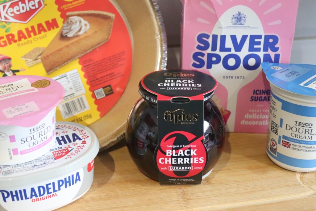 [Ad- gifted product] When it comes to the holiday season, often baking and cooking go hand in hand. Whether you have a holiday party coming up or just want to have a no-fuss dessert to bring to a friends house, we’ve found a way to make a no-bake cheese cake something more impressive. Using easy ingredients and minimal effort, we’ve created a no bake cheesecake Opies Black Cherries in Kirsch. The recipe is even easier if you can get your hands on a pre-made biscuit base, like graham cracker crusts, to go along with your cheesecake.