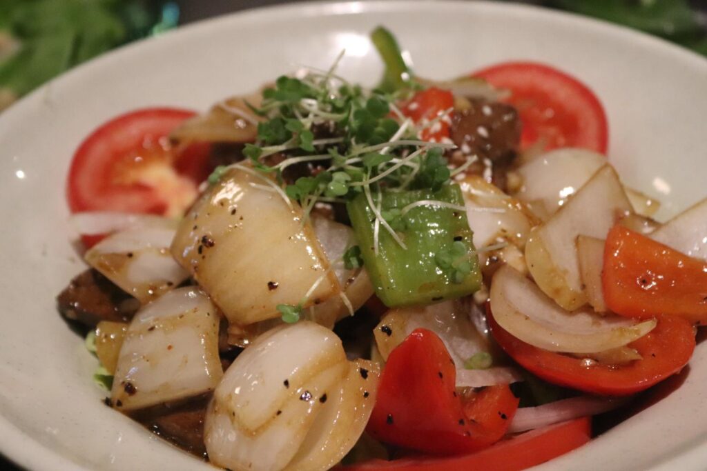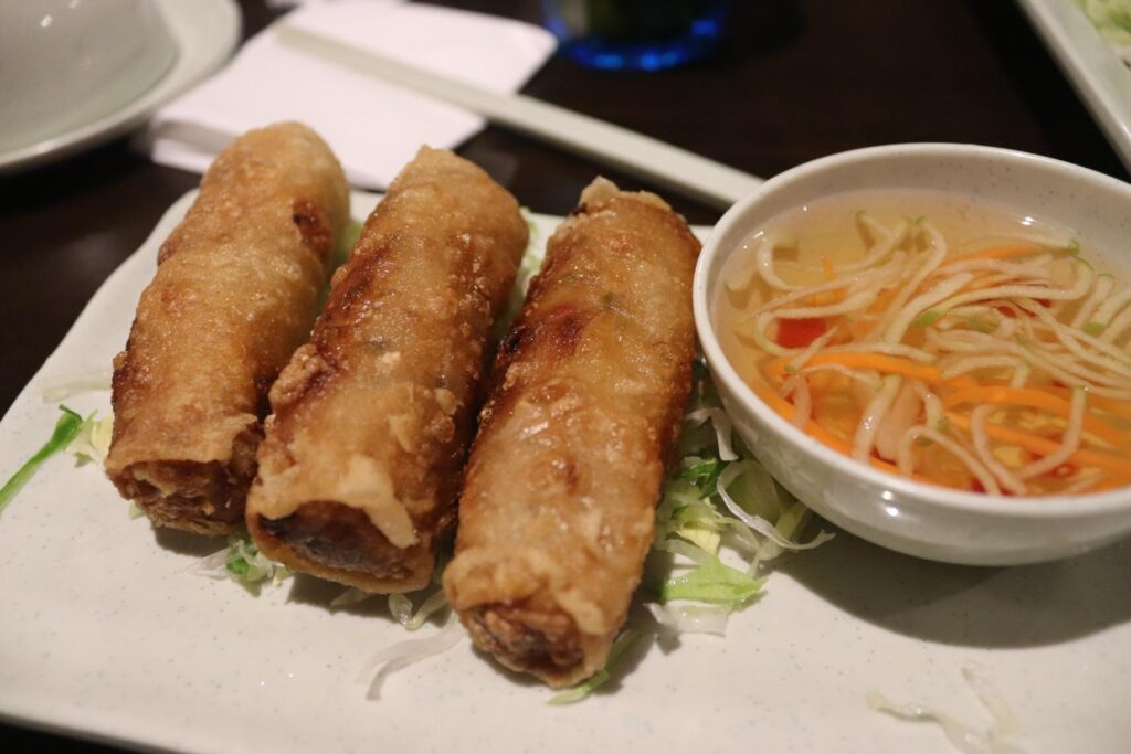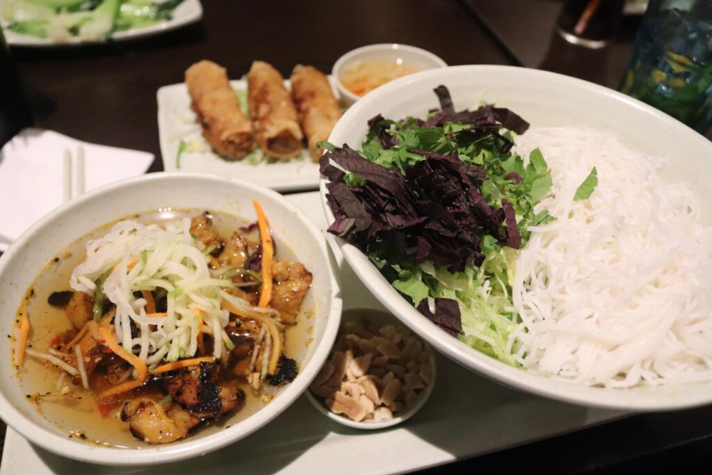 My favorite dish from Nom Nom Restaurant is Bun Cha Ha Noi, which is a noodle dish. This had charcoal grilled pork with the sauce I like very much, along with some salad. It use to come with spring rolls, but now these are a separate starter that you need to order to go with it. I combine everything together and eat it like one big dish! I absolutely love the flavor of the pork, the sauce, and the crispy spring rolls. The spring rolls at Nom Nom are unmatched! Dann ordered some Marbled Shaking Beef, which had loads of onions, peppers and tomatoes with it. He normally doesn’t eat onions, as he as an intolerance, so was surprised at the amount. The beef tips in the sauce was fantastic though, really tender and full of flavor.