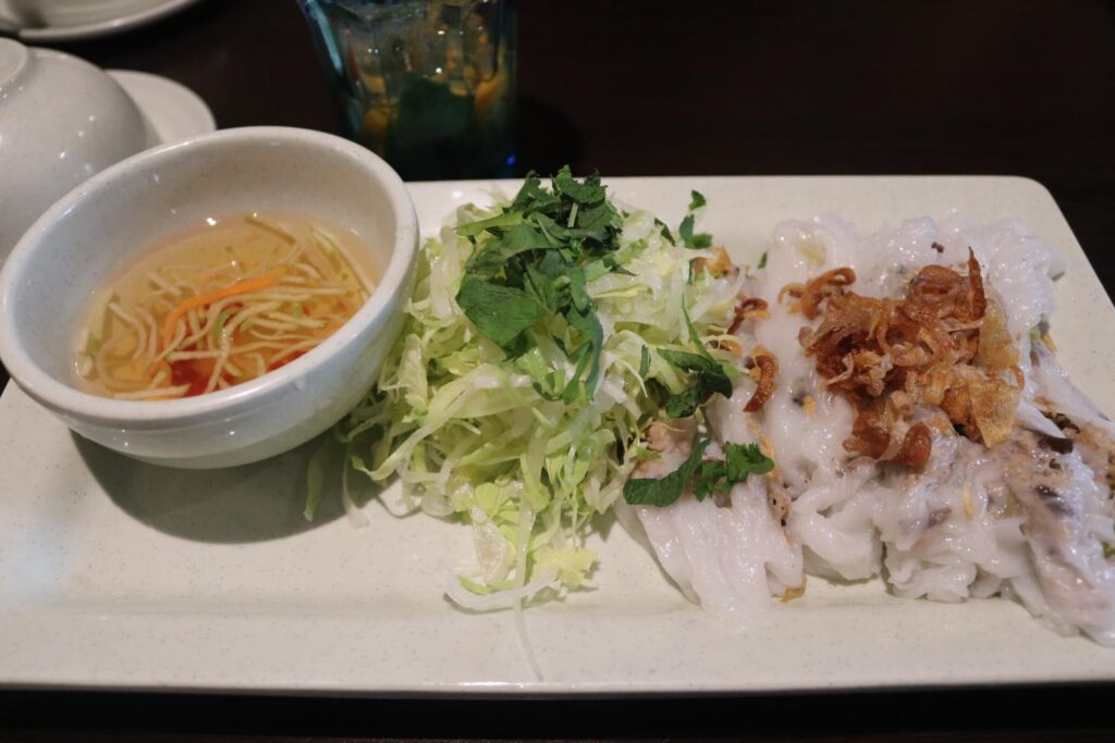 One of Quang’s favorite dishes are Steam Rolls. These are hand-made rice rolls, that have pork or mushrooms in the middle. They come with my absolute favorite sauce, along with a little salad. The texture is quite different from any of the other foods I have ever had, but the flavor is fantastic. Dann and I each had a plate, which we enjoyed very much. Dann also got some lime-cured beef, which is sort of like beef tartare. It wasn’t what he had expected, but he did like the citrus flavor throughout. The dip was interesting; sort of like a pea puree but not really pea tasting. More earthy in flavor.
