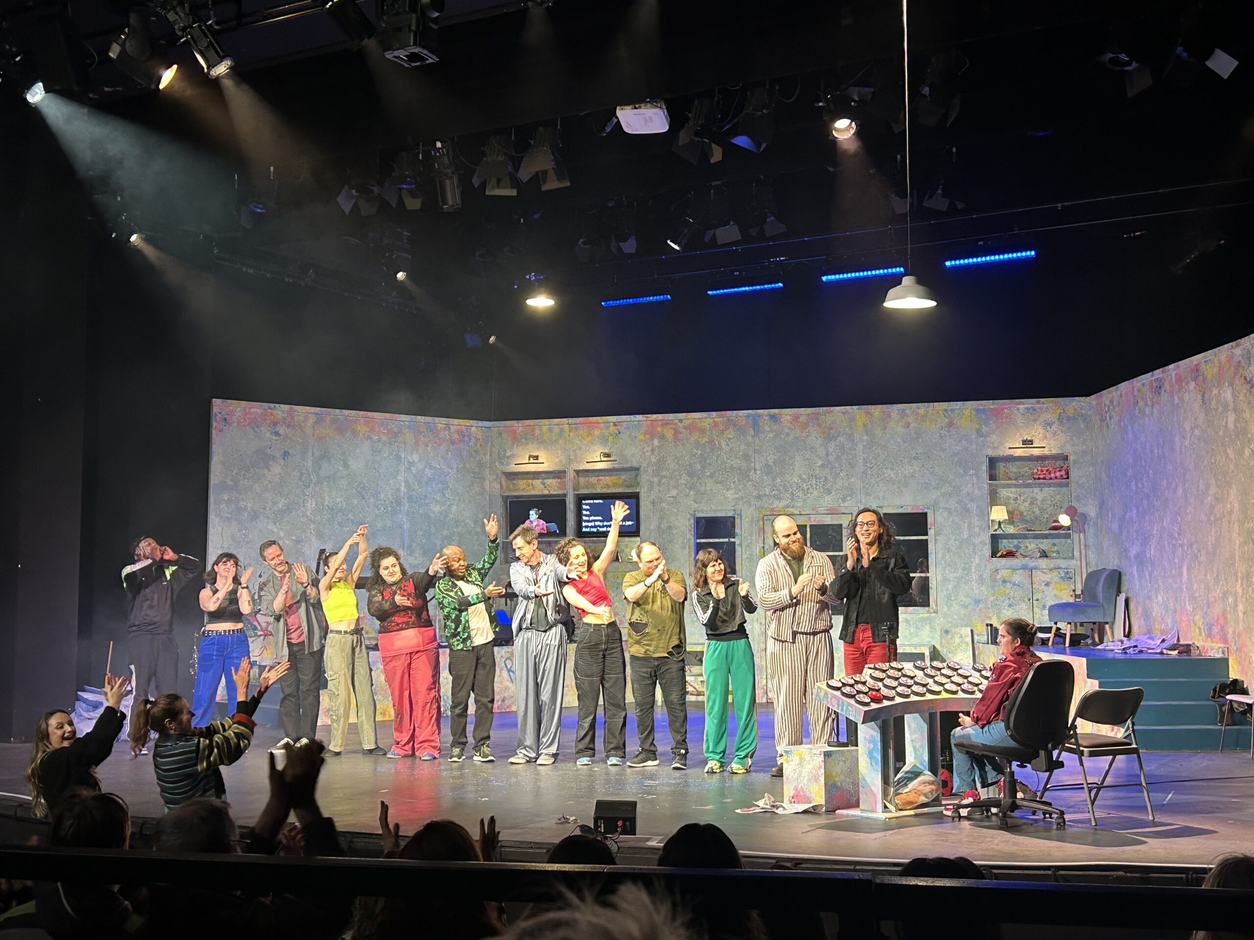 Rachel is a learning-disabled individual who finds all of this quite funny! When we first got there, the stage was full of people dancing and signing along to the songs that were being sung. When it started, Rachel’s sister Flo gave a big introduction on how this entire play works. There are some interesting aspects of the stage; a TV screen where we can see Rachel’s face, a panel next to it where we could see words typed out if Rachel speaks, and about the buttons on the panel. There are also a bunch of words that appear on the walls, for some of the mini-games, but otherwise everything is signed in BSL.