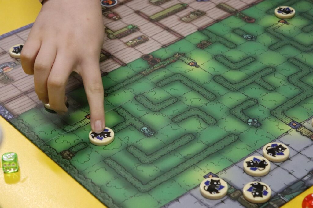 Setup for the round is extremely simple; the guard looks away while the ninja cats make all of their cats into shadow cats (as the player tokens are double sided) and they get placed at the back end of the board. Then, everyone looks at the board. Starting with the guard, they roll their dice and then pick which die they used for which token. It’s one die per token, with the guard having two. They then need to move their guard on the grid. It moves to the next player, who rolls their dice, and picks two shadow cats to move up to the number on each of the individual dice. It’s simple after that, each player rolling, moving, and continuing around.