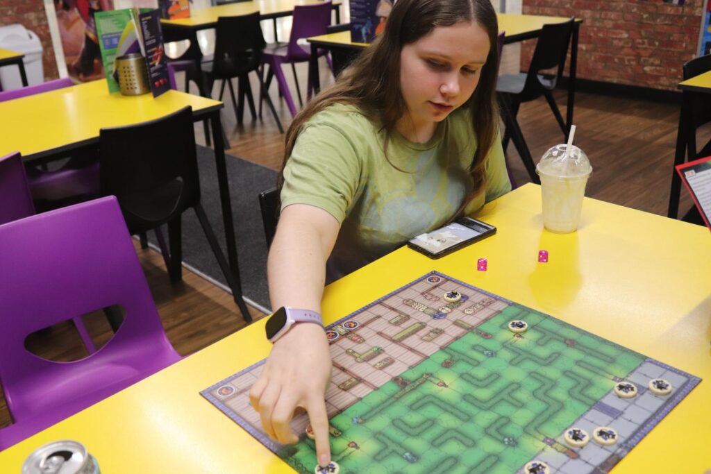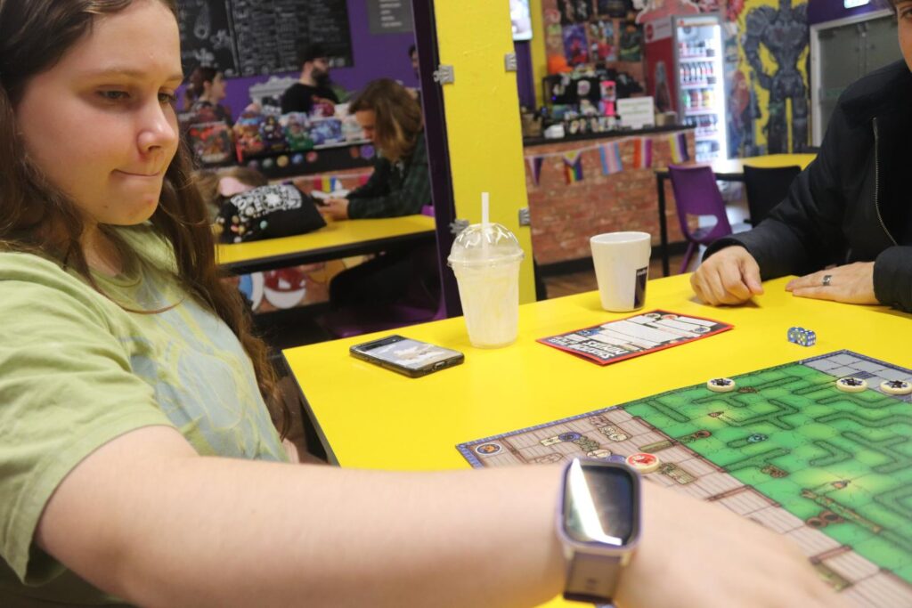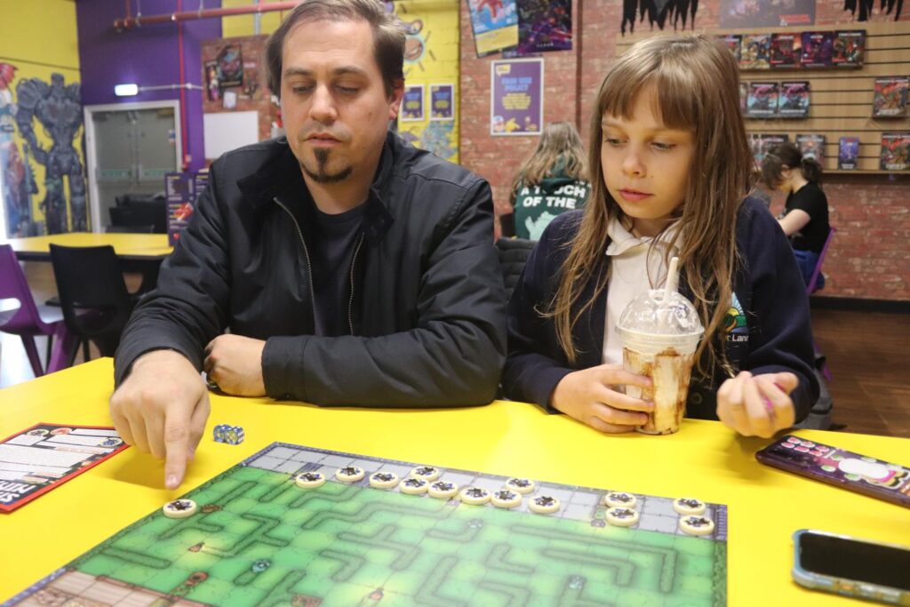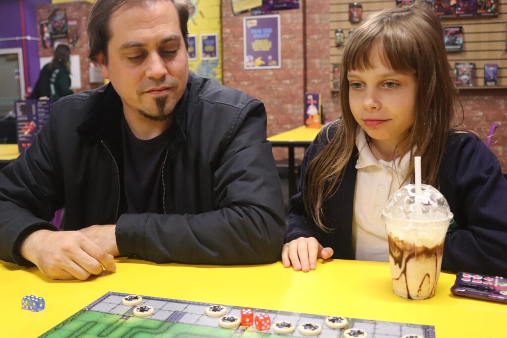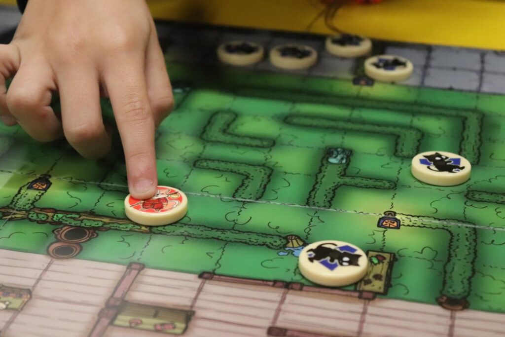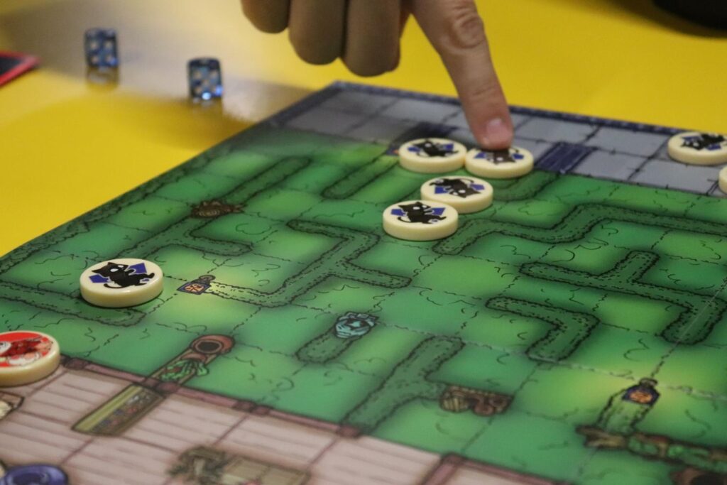 For the guard to reveal a token, they just need to have that token in their line of sight. The board itself has a lot of corners, and you cannot walk through walls or bushes, meaning there is a sort of path to follow and look down. The game itself felt very well balanced and I did like that we all had our own colored dice, so didn’t need to pass them from one player to the other, making the game very quick to go through aswell – though this might be why we lost track of ourselves! Robin started as the first guard, quickly finding her way across the board and revealing shadows, but Dann moved a few of the shadows up, getting his character to the koi pond. After that, Amelia took on the role of guard where she quickly got two of them revealed, before finally getting me!