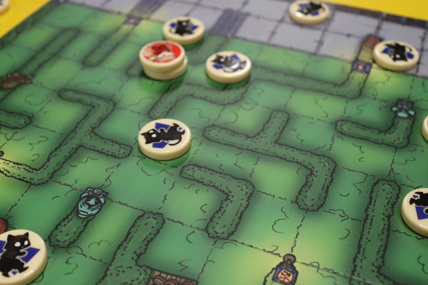 Setup for the round is extremely simple; the guard looks away while the ninja cats make all of their cats into shadow cats (as the player tokens are double sided) and they get placed at the back end of the board. Then, everyone looks at the board. Starting with the guard, they roll their dice and then pick which die they used for which token. It’s one die per token, with the guard having two. They then need to move their guard on the grid. It moves to the next player, who rolls their dice, and picks two shadow cats to move up to the number on each of the individual dice. It’s simple after that, each player rolling, moving, and continuing around.