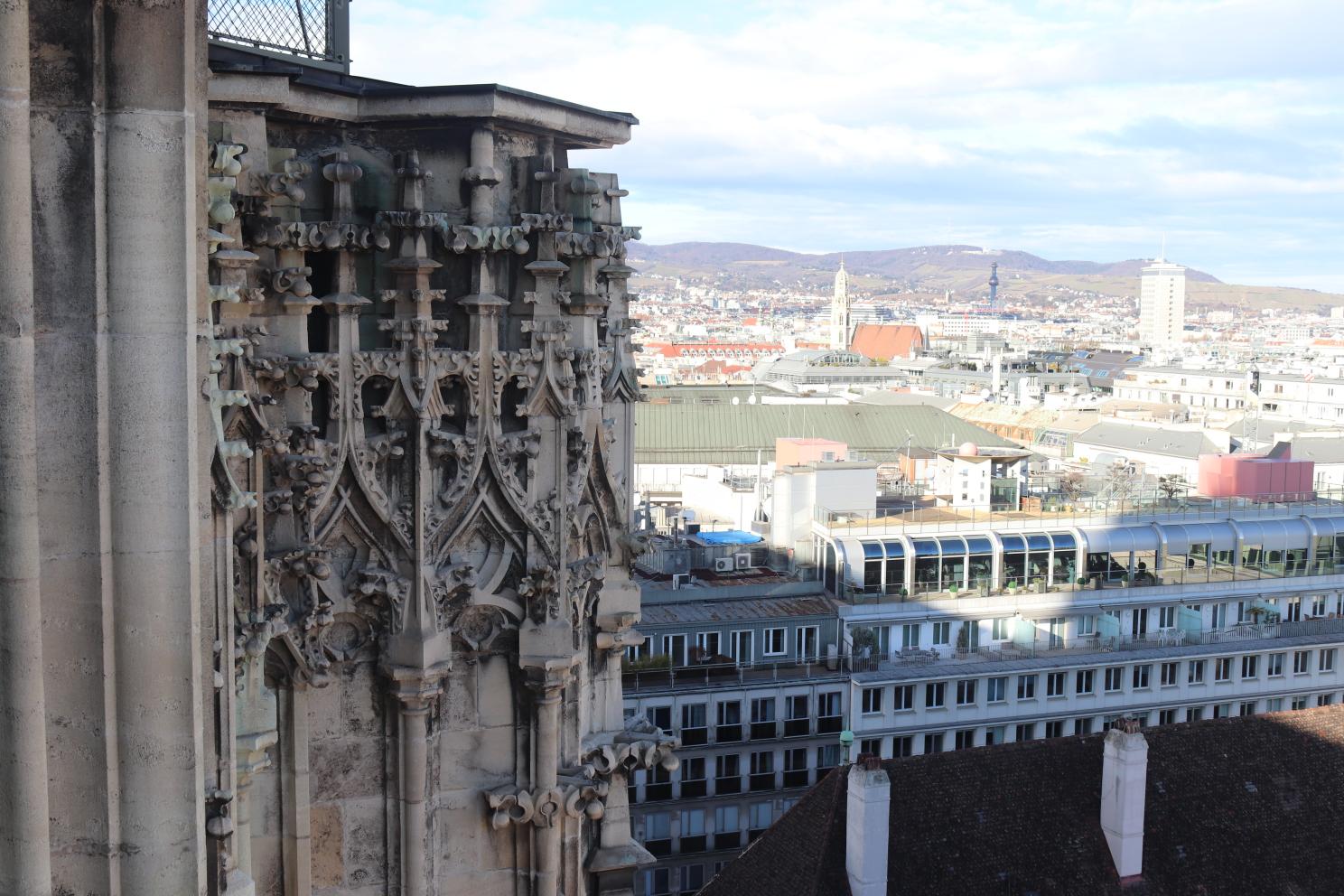 There is a giant bell that is at the top, along with a plaque (not in English) that tells you when the bell rings. This bell is truly one of the biggest I have ever seen and I wouldn’t want to be on the roof when it’s ringing! The view from the top of St. Stephen’s Cathedral is a stunning one, almost as stunning as inside, with a great view of other churches around the city and of the various modern buildings that have been built around it too.
