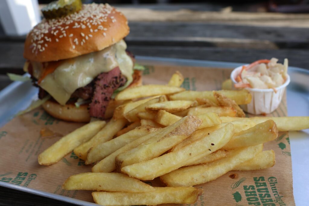 [Ad- gifted experience]Â Mayfield Farm has a handful of places to eat during the summertime! A few weeks back, we went to see Caine’s Pizza when it opened, and now that The Pig’s Head Pub has opened up, we went back over to try out their burgers. The Pig’s Head Pub is a part of the Churchgate Sausage Shop – so you know that the meats that they are cooking up will be premium. We went on a Friday evening, where the outdoor seating was full and everyone was having a great time. It is worth mentioning that they do have a breakfast menu,, if you fancy that.