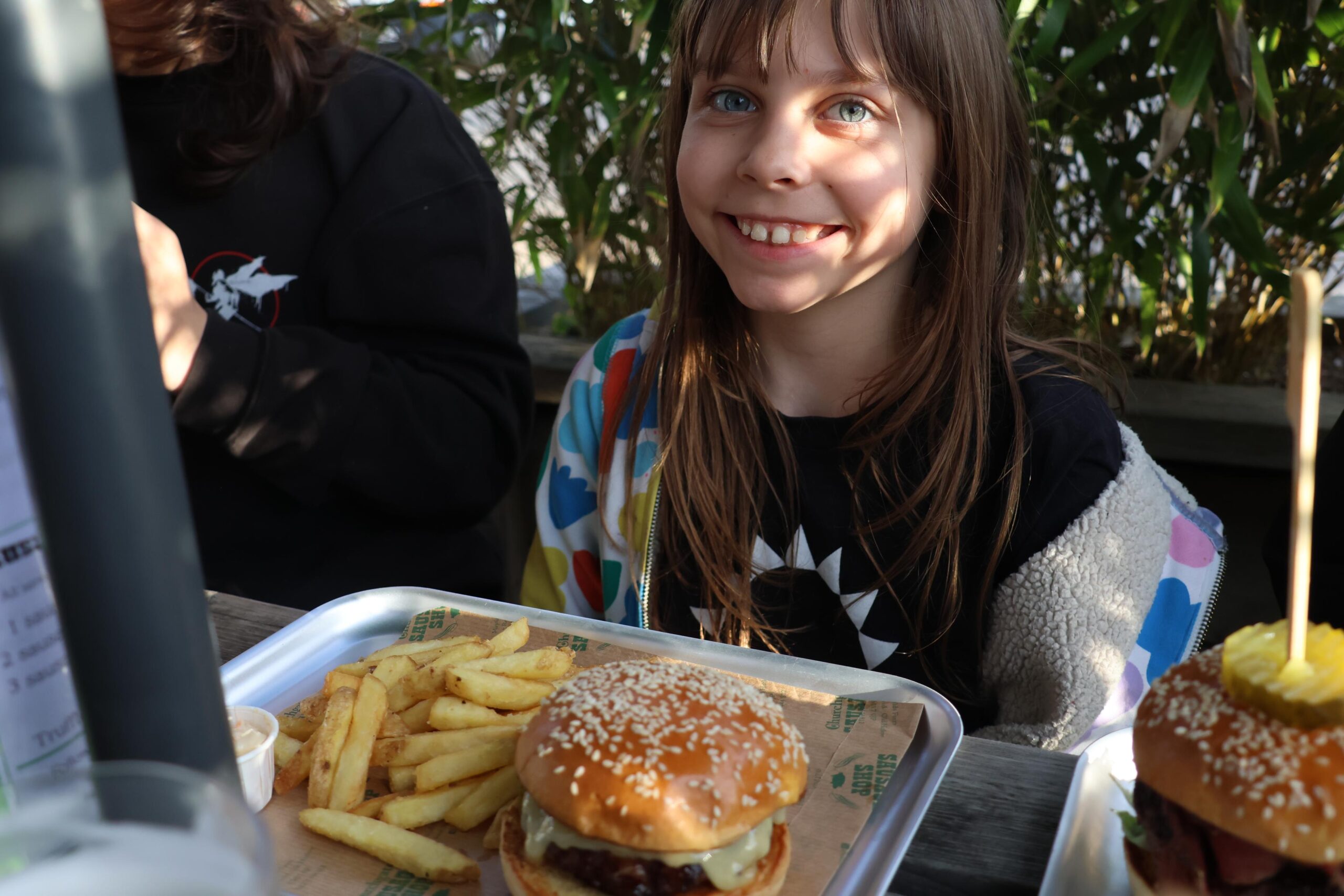Robin, of course, went with the build your own burger which does have a bunch of very fun toppings like smoked bacon, stilton, a fried egg… but she picked cheese, pickles, and ketchup to go on hers. This very much works for younger kids, as they can just pick and put on whatever they want. She said her burger was “very yummy” and it did have a ton of pickles, exactly how she liked them, under the bun.