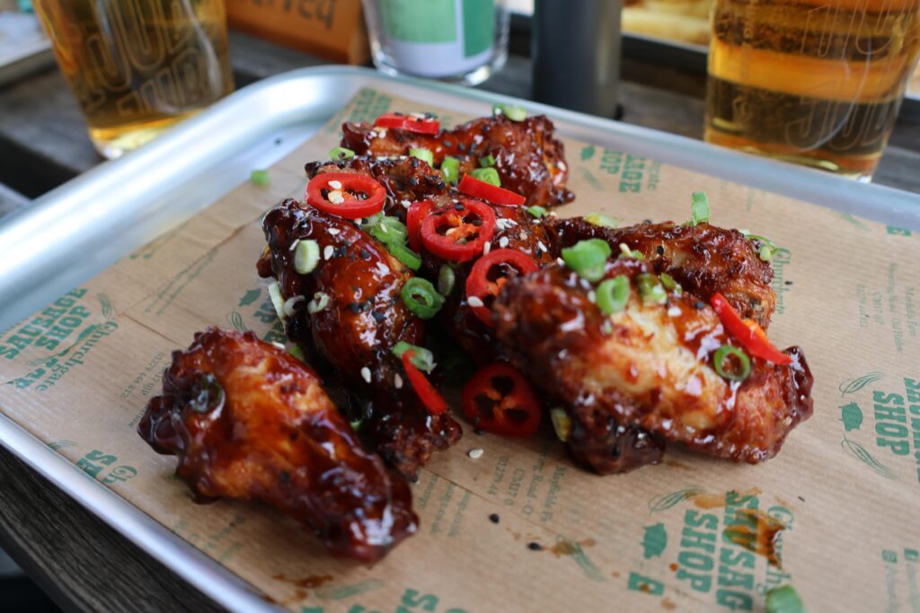 As The Pig’s Head Pub is a part of Churchgate Sausage Shop, they have a bunch of fresh, warm sausage rolls. So, of course we had to try one! We got the cheese and marmite sausage roll, as it is something a bit different. There was clearly a lot of cheese in it, making it quite moist, along with a bit of a deeper flavor from the marmite. The outside of the roll was flaky and perfectly cooked too. We also grabbed some of their hoisin wings, which were perfectly crispy and coated well with sweet and sticky hoisin sauce.
