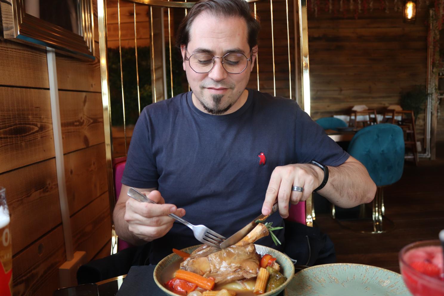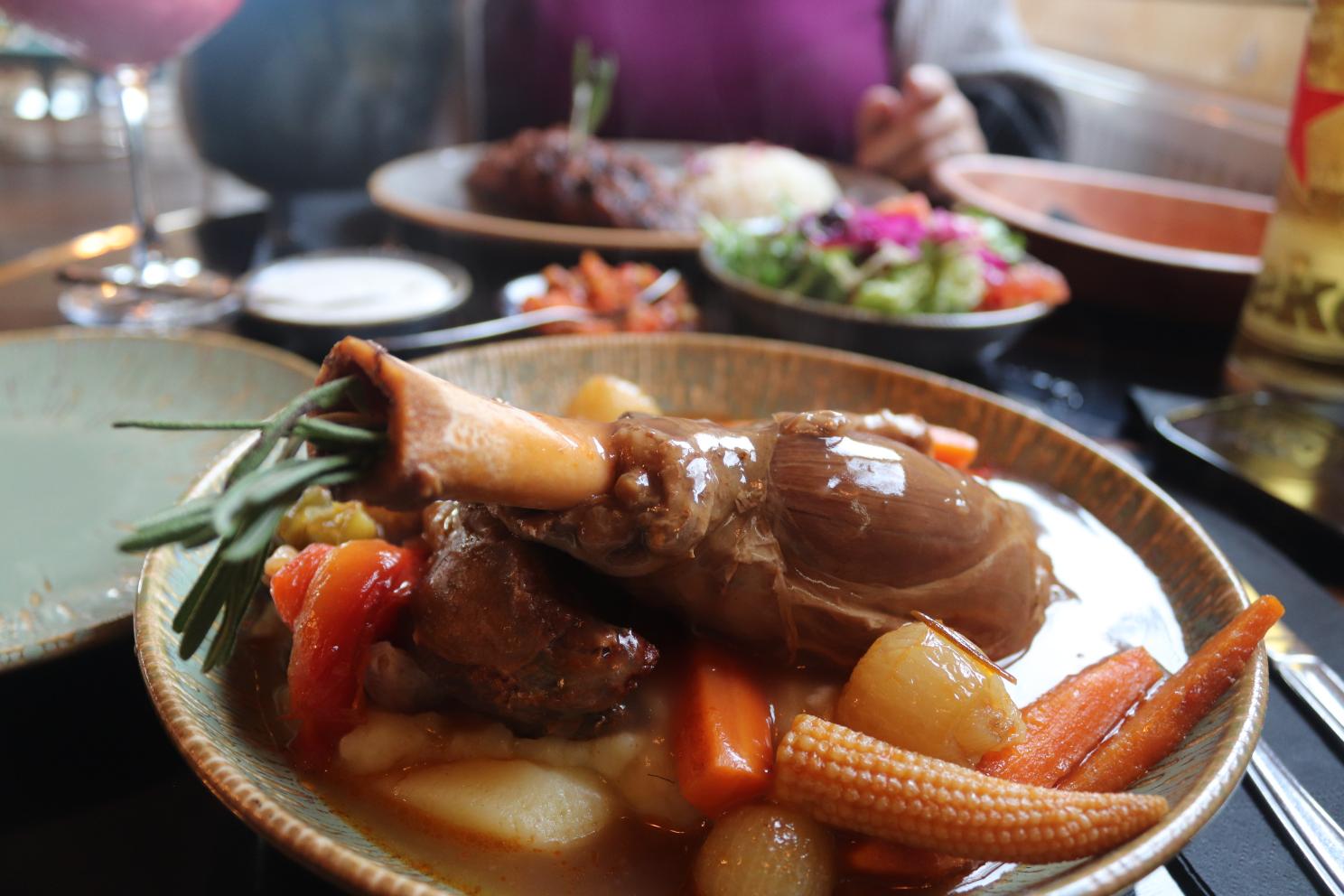 Dann and I went for a sort of lamb theme for our actual mains! I got char-grilled kofte, which had some fantastic grill marks on it. This is a lamb patty, which has tons of spices and some vegetables mixed in as well. I really loved the flavor on this – it was just so well seasoned. It came with rice and a side salad that wasn’t as well dressed as the one that came with our starters, but was good to cut through how meaty the main was. I really enjoyed it all, the rice was well cooked too. Dann got a massive lamb shank, which was fall of the bone tender. It came in some gravy, with a bunch of vegetables and potatoes, which was very filling! We both were pretty stuffed by the end of our mains.