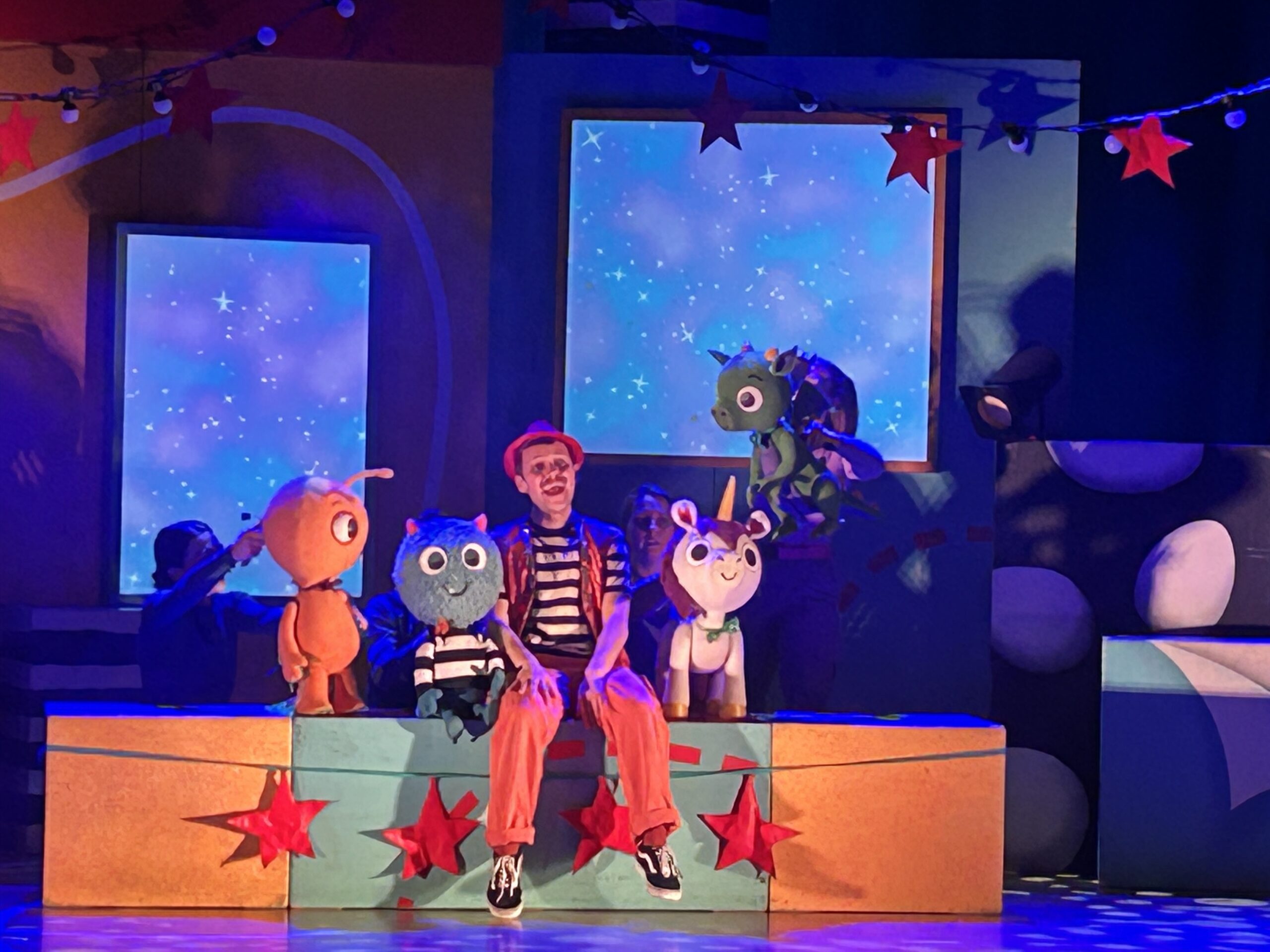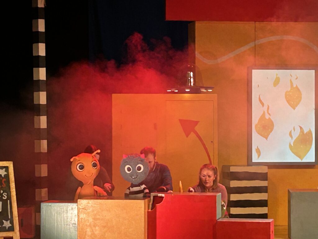 That is, until a monster escapes their book and ends up on stage! The monster, which is a quite fun puppet, starts causing chaos (despite the audience warning everyone), which brought out more singing, more dancing, and even a bit of worry from the main character himself. The worry goblins of his appear behind him, on these window-like screens that often show some of the things that are more magical.