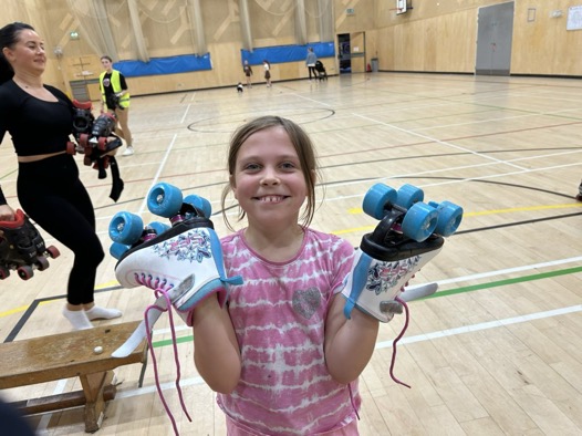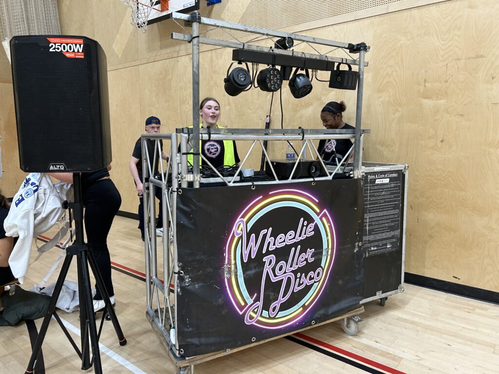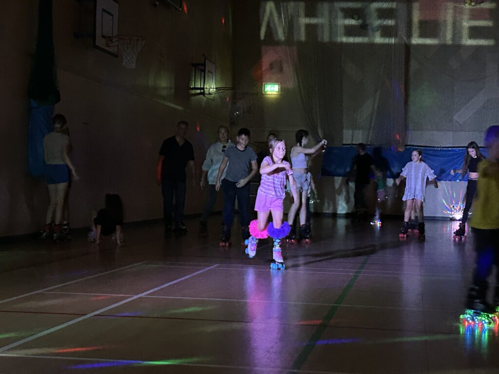 The Wheelie Roller Disco had two different ticket prices; one with skate hire and one without. Robin brought her own skates, while Amelia and I rented. The actual venue was a school, where they had taken over a gymnasium, setting up some (very low) benches to get skates on or sit, a DJ booth, and lots of lights / projectors. This was a very good use of the space, though I had never been to a skate rink that didn’t have some sort of side bit to cling to, which we instantly knew would be a problem for Amelia, but we pressed on!